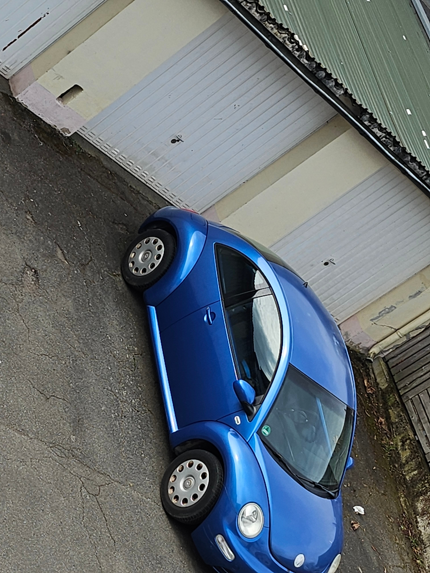 A blue Volkswagen Beetle is parked on a cracked asphalt surface next to a light-colored garage structure with a green roof. The garage has vertical panel doors and a concrete base. The car is angled t…read more