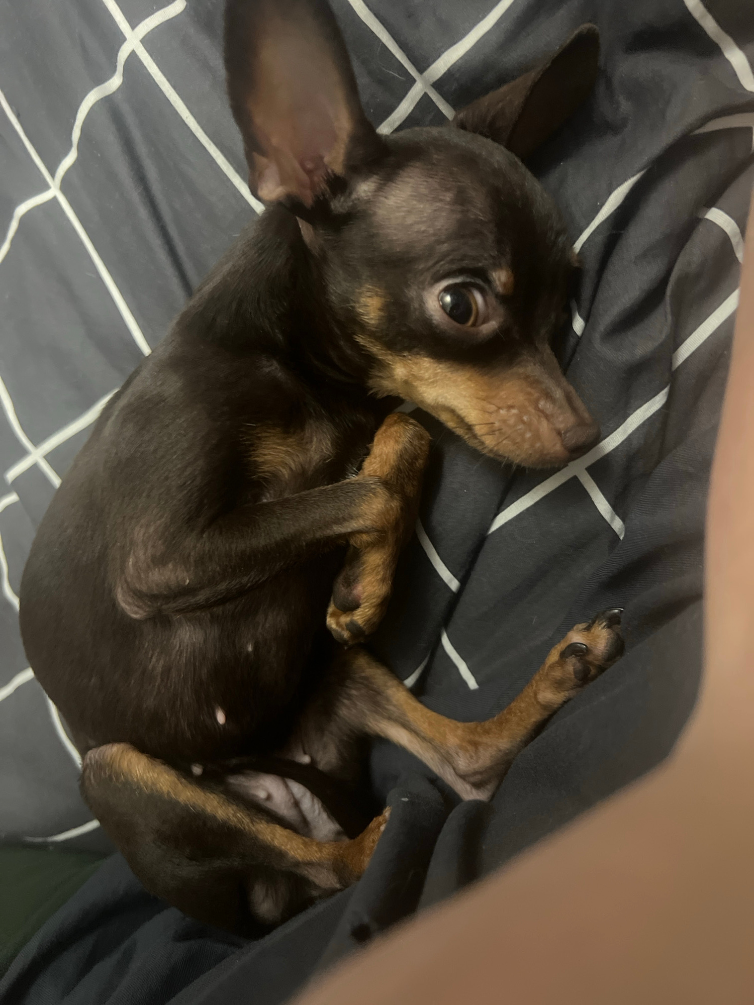 A small, brown and tan dog is lying on its back on a gray and white checkered blanket. The dog is partially covered by a dark gray blanket. The dog's eyes are open and it is looking upwards. One of itβ¦read more