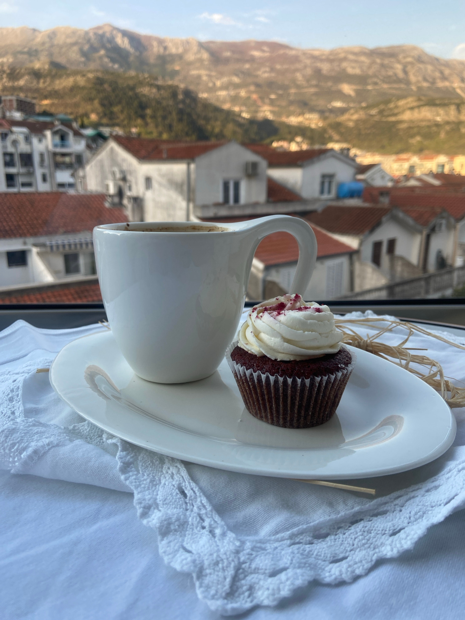 A slightly rotated, high-angle, eye-level shot depicts a white coffee mug on a matching saucer and a cupcake on a white crocheted tablecloth, with a cityscape visible through a window. The white coff…read more