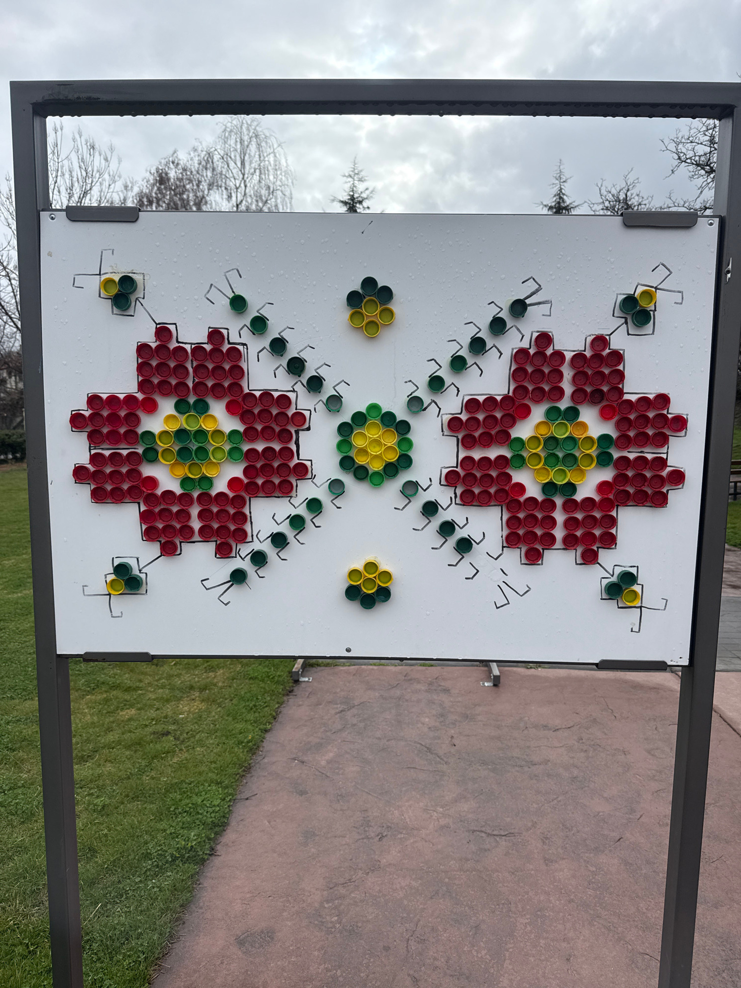 The image shows a sign with a decorative folk art design, likely located in Sapareva Banya, Bulgaria, given the mention of the city. The sign features a white rectangular board framed by a dark metal…read more