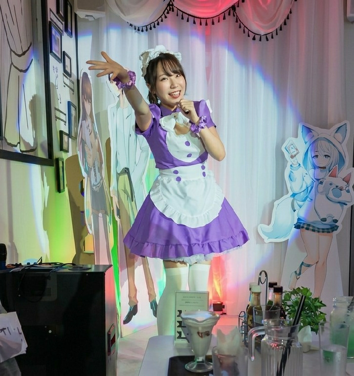 The scene is an interior view of a commercial establishment located in Shinjuku, Japan. A young adult female is positioned centrally, smiling directly at the viewer with her right arm extended upwards…read more