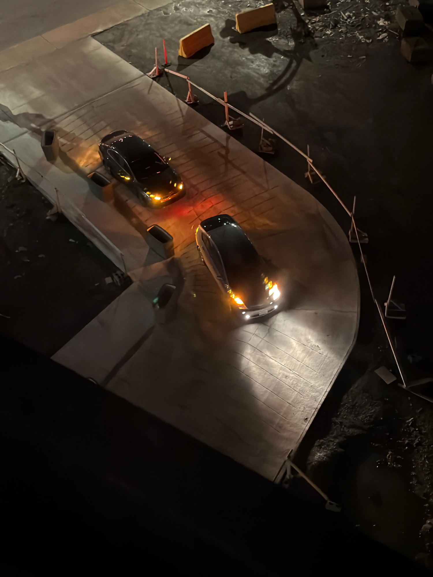 The image, taken at night, shows an aerial view of a curved driveway or roadway in Laval, Canada. Two dark-colored vehicles with illuminated headlights and taillights are visible on the pavement. The…read more