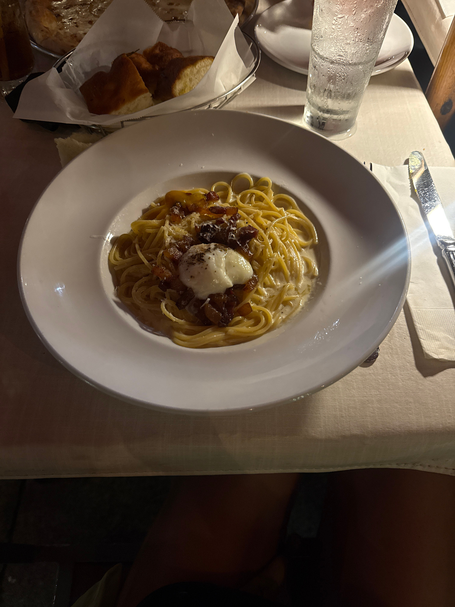 The image shows a plate of pasta with a creamy sauce, topped with a white ball (possibly cheese or burrata) and some darker pieces (likely meat or vegetables), set on a white tablecloth. Beside the pl…read more