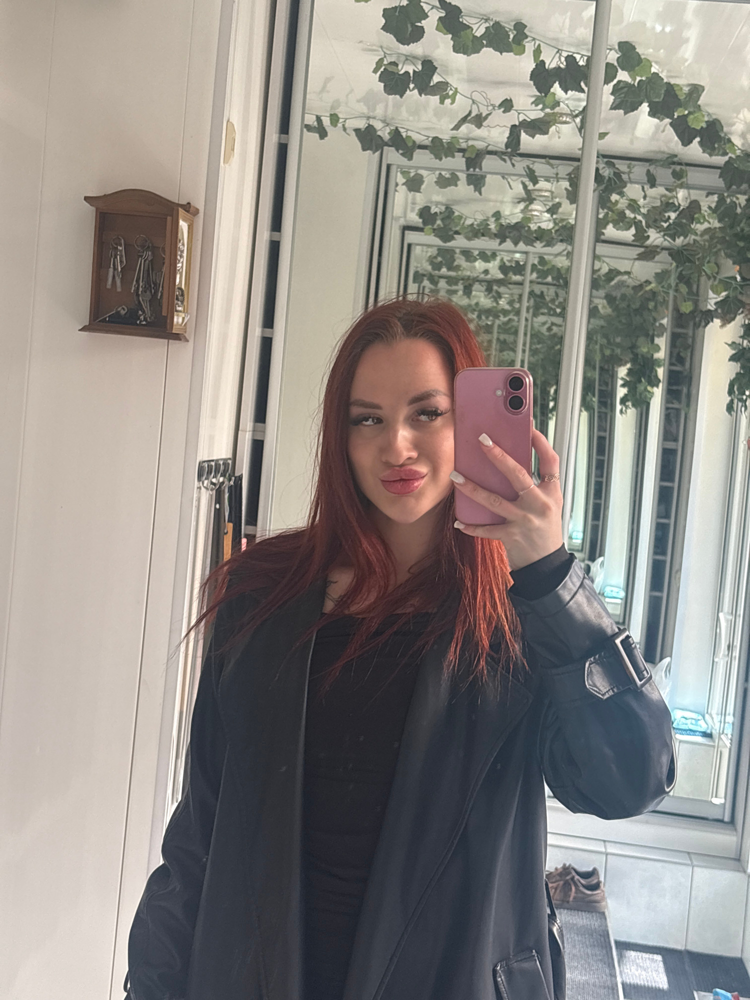 A woman with red hair is taking a selfie in front of a window decorated with artificial vines. She is wearing a black leather jacket. In the background, there is a set of keys displayed in a small woo…read more