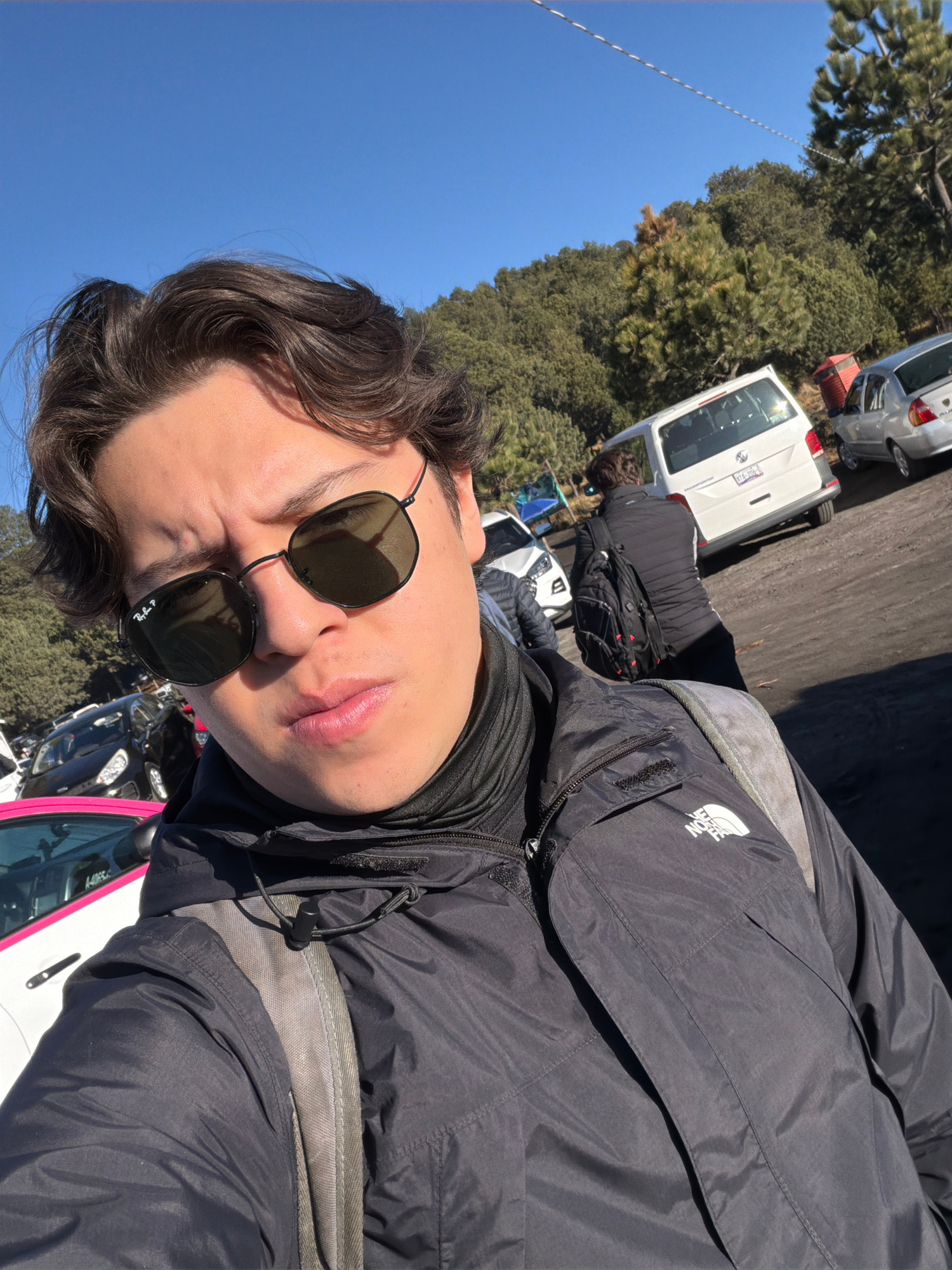 A selfie of a person with sunglasses and a black jacket, positioned in front of a backdrop of vehicles, trees, and a clear blue sky. The photograph's location appears to be Unknown, Mexico. The person…read more