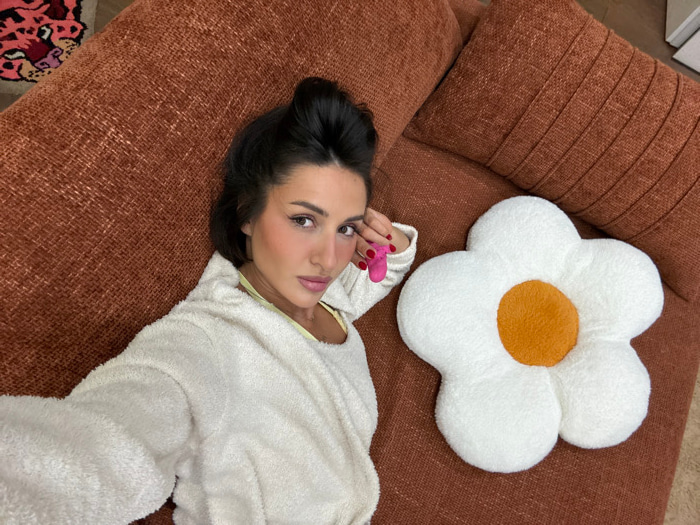 A woman lies on a terracotta-colored couch with a textured fabric, wearing a white, fuzzy robe. She is looking up at the camera while holding a small, pink object. Next to her is a large, white daisy-…read more