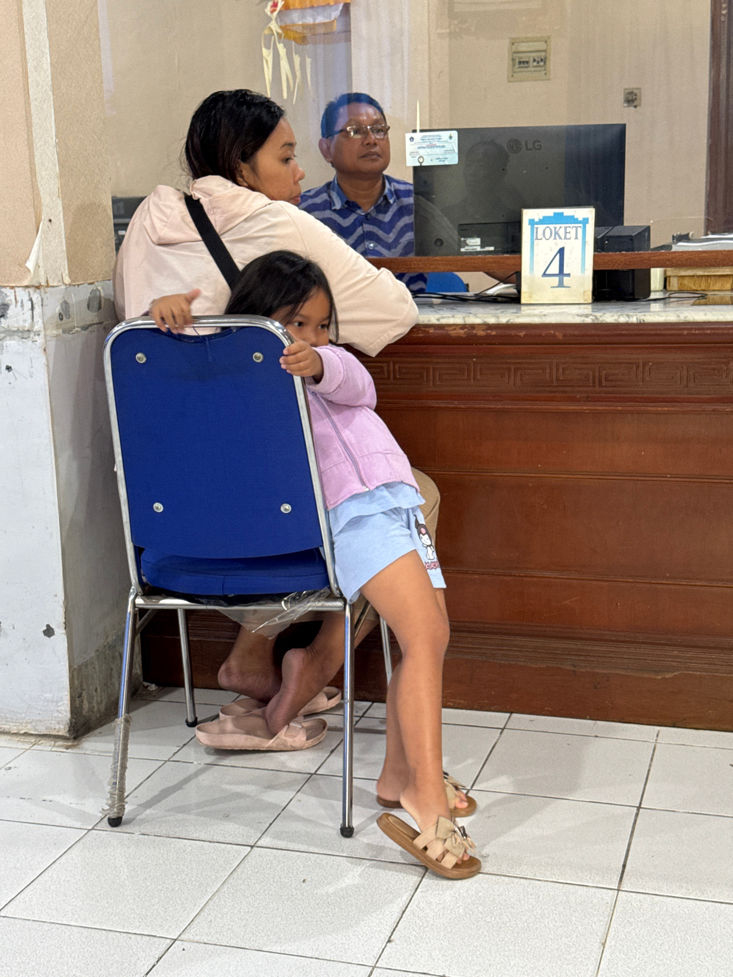 Inside what appears to be an office or waiting area in Kuta, Indonesia, an Asian woman wearing a tan top with a black shoulder bag is sitting on a blue and silver metal chair, holding a young child. T…read more