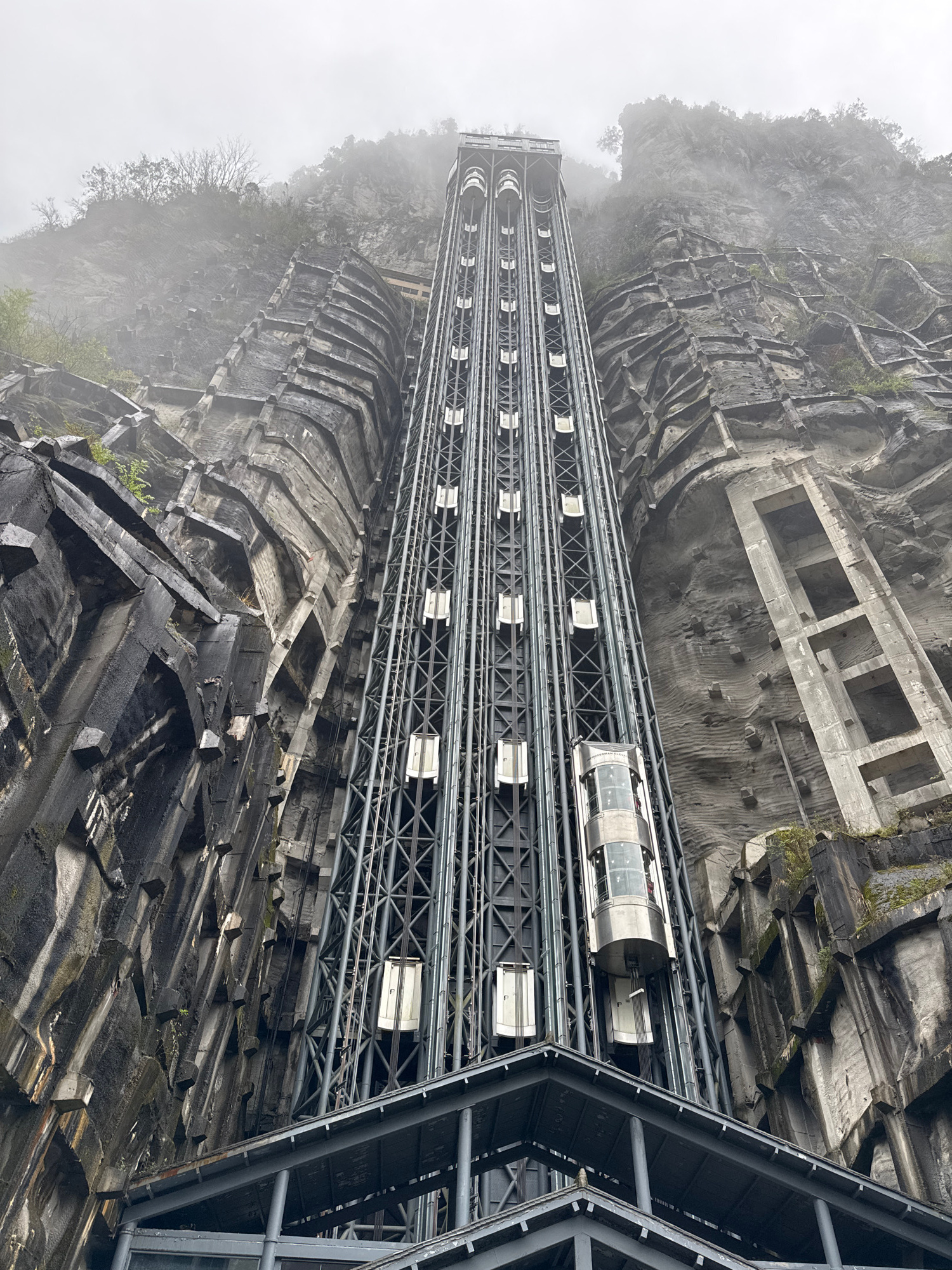 This image depicts the Bailong Elevator, a glass elevator built into the side of a cliff in the Wulingyuan scenic area, Wulong District, China. The elevator appears to be ascending within a tall metal…read more
