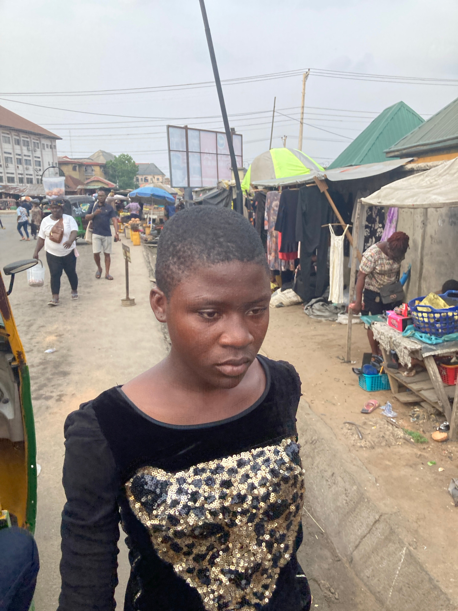 The image shows a young person, possibly female, with dark hair and skin, wearing a black top with gold sequined detailing. She appears to be in Aba, Nigeria, based on the surrounding environment. Th…read more