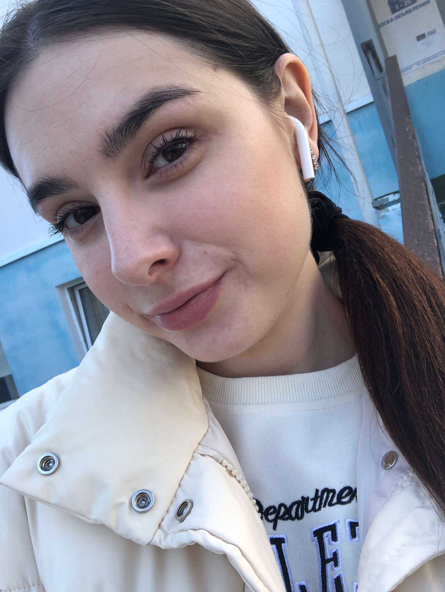 A young woman poses for a selfie outdoors. She is wearing an off-white sweater with "department" embroidered on it, covered by an unzipped off-white puffer jacket. Her dark brown hair is pulled back i…read more