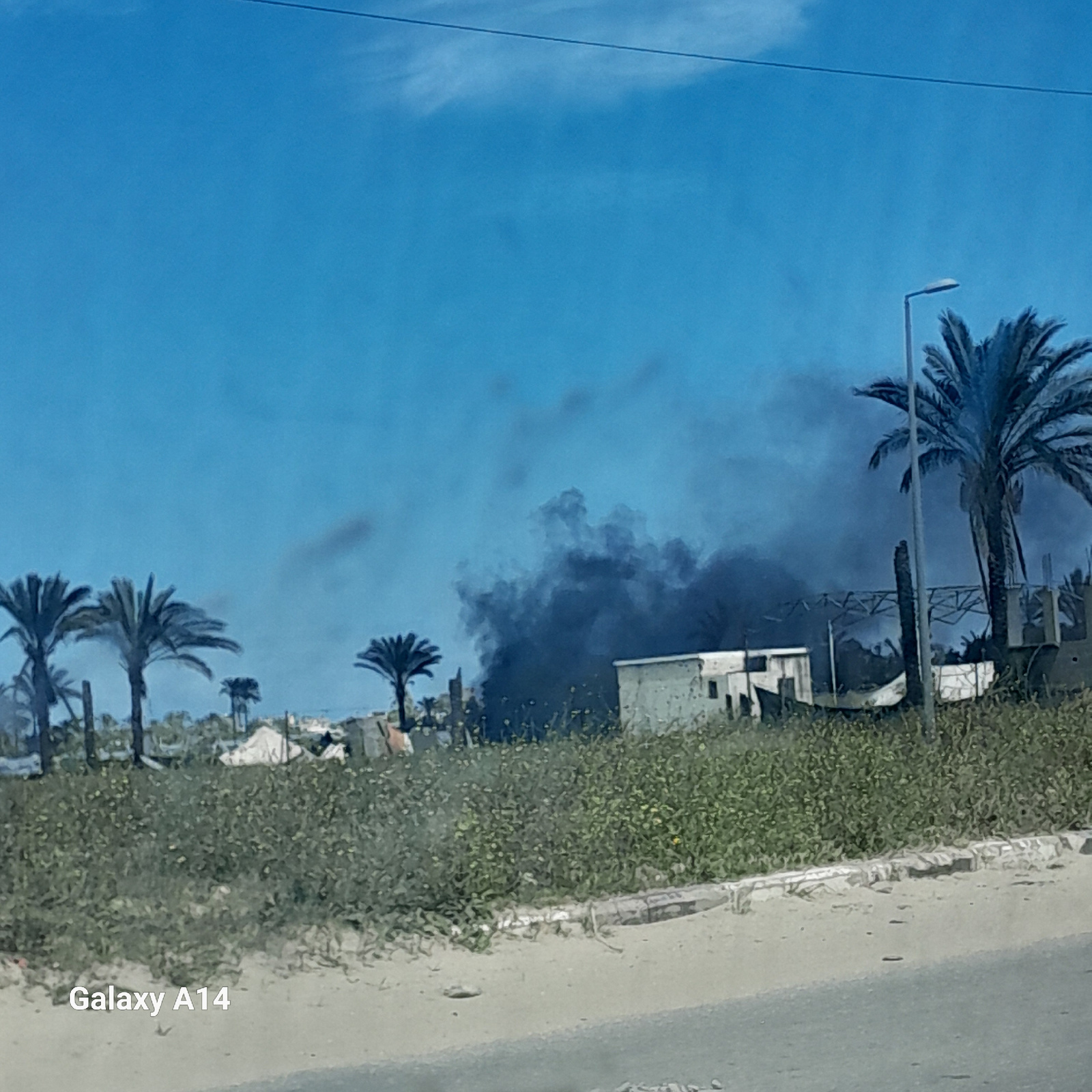 The image depicts a scene in Nuseirat, Palestinian Territory, featuring several palm trees lining a street. A plume of black smoke rises into the bright blue sky behind buildings adjacent to the stree…read more