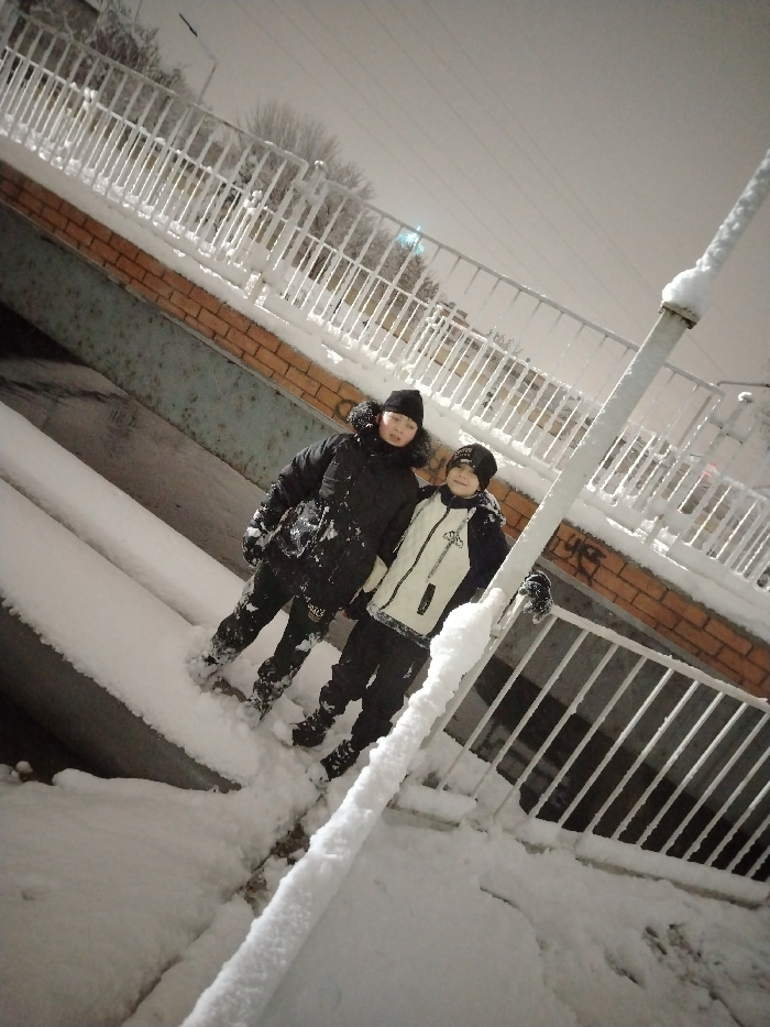 The image displays two individuals, likely juveniles, standing on a snow-covered elevated walkway or bridge structure at night in what appears to be an urban or suburban environment in Tashkent, Uzbek…read more