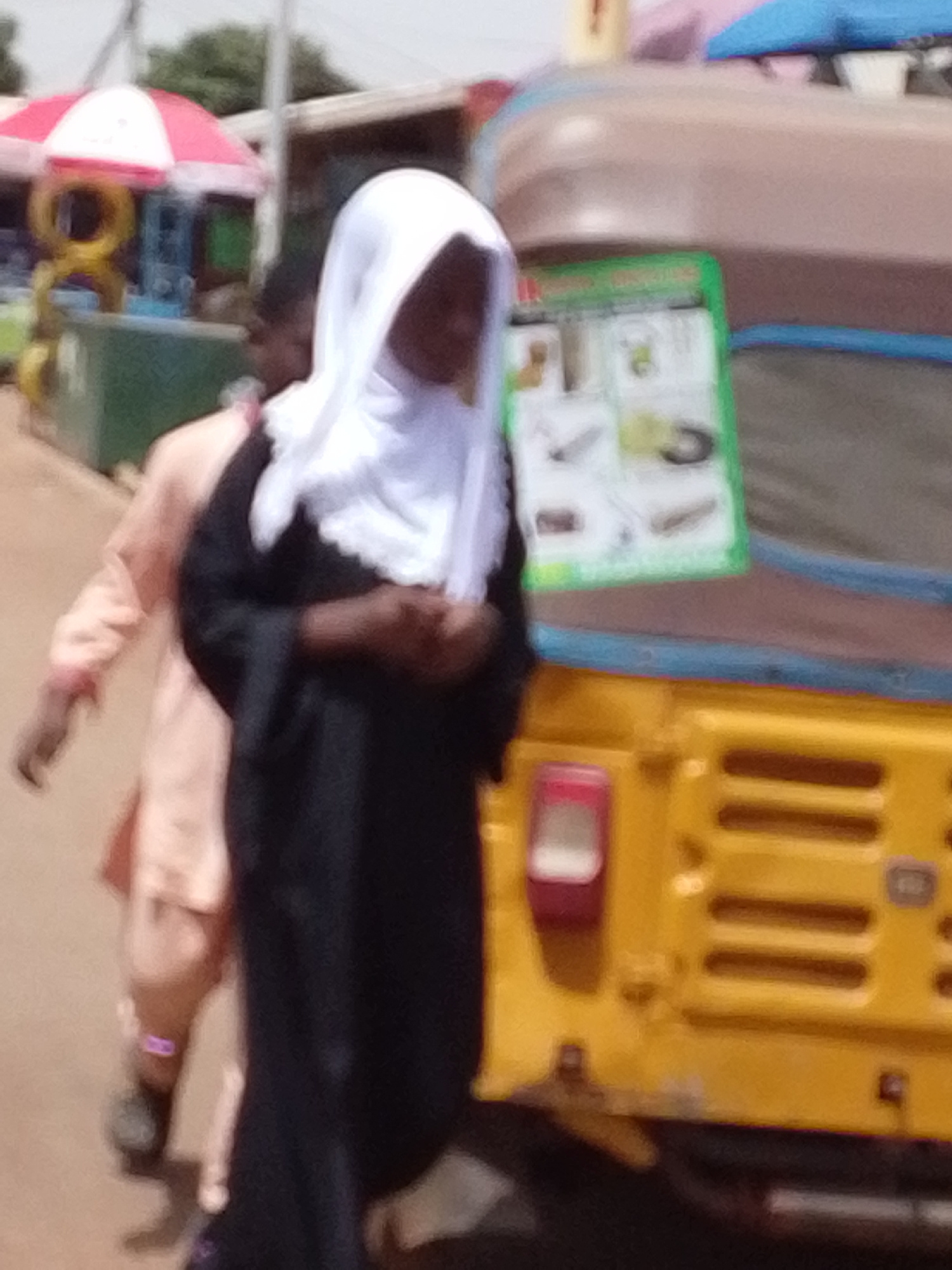 A young woman wearing a white headscarf and a dark-colored robe is seen walking on a street in Tamale, Ghana. Next to her is a man wearing a light peach colored shirt and pants. Next to the woman is a…read more
