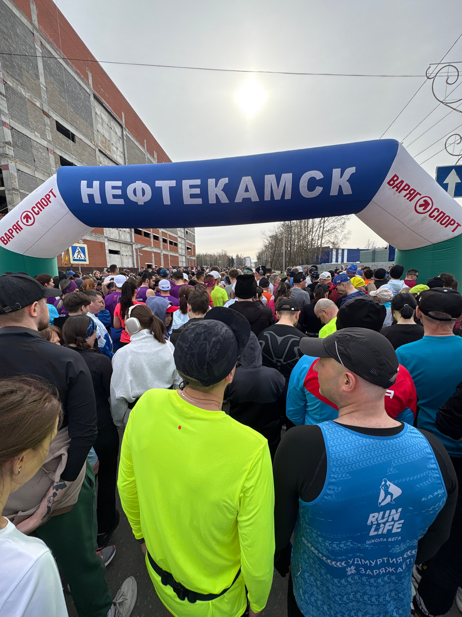 The image shows a large group of people gathered under an inflatable arch labeled "НЕФТЕКАМСК" in Cyrillic script, indicating the location is likely the city of Neftekamsk, Russia. The arch also bears…read more