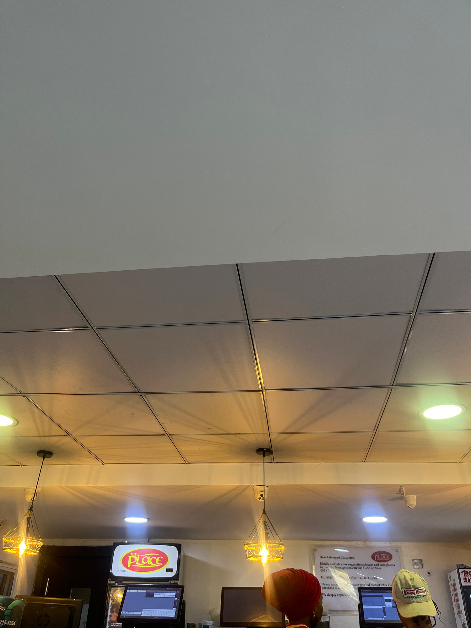 The image shows the interior of a commercial establishment, likely a restaurant or retail store, located in Ikeja, Nigeria. A wall on the left is painted white, contrasting with a modular wall system…read more