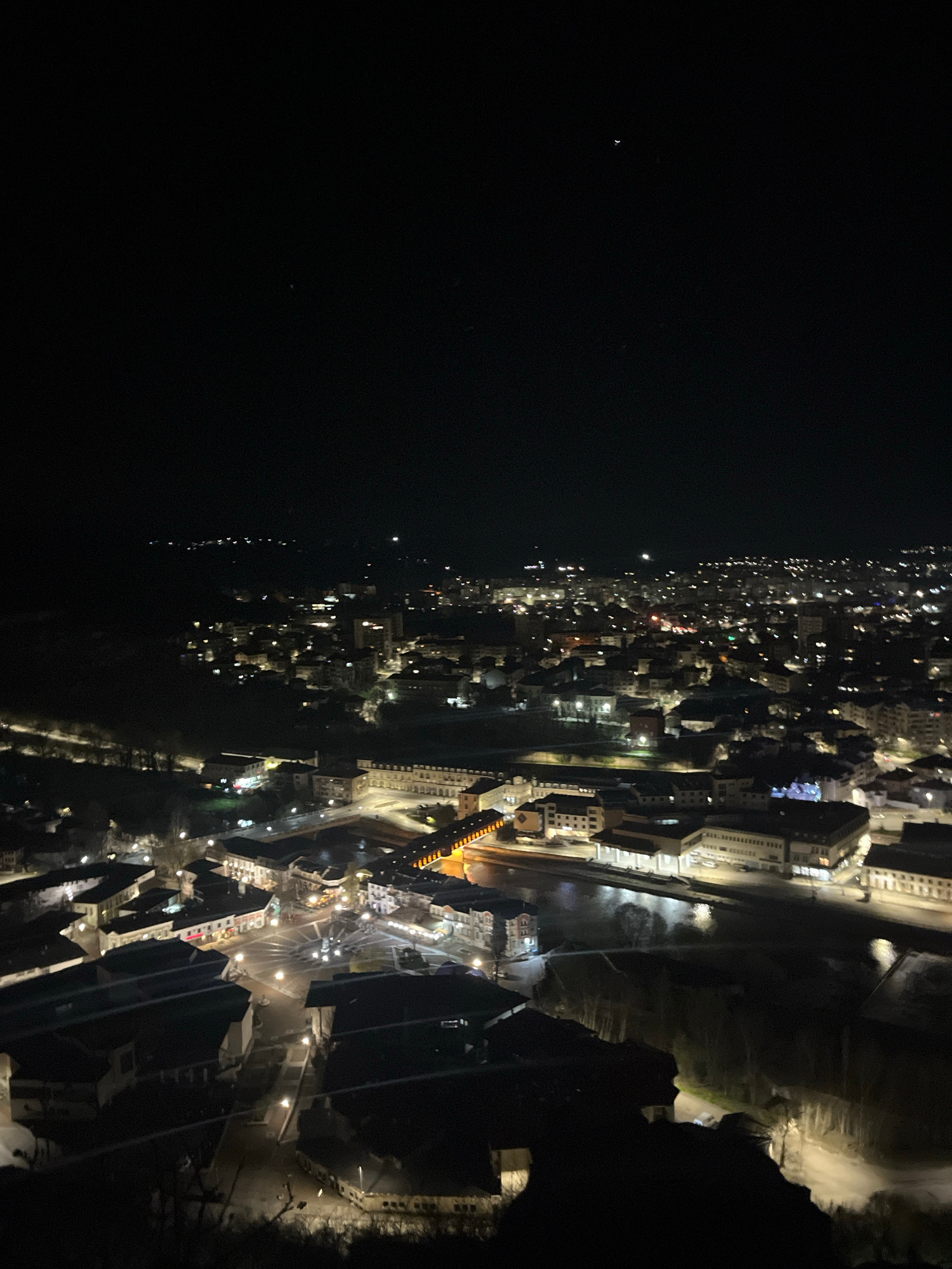 The image is a nighttime aerial view of Lovech, Bulgaria. A river runs through the city, its course marked by reflections of streetlights and buildings. Clusters of buildings and houses, illuminated,…read more