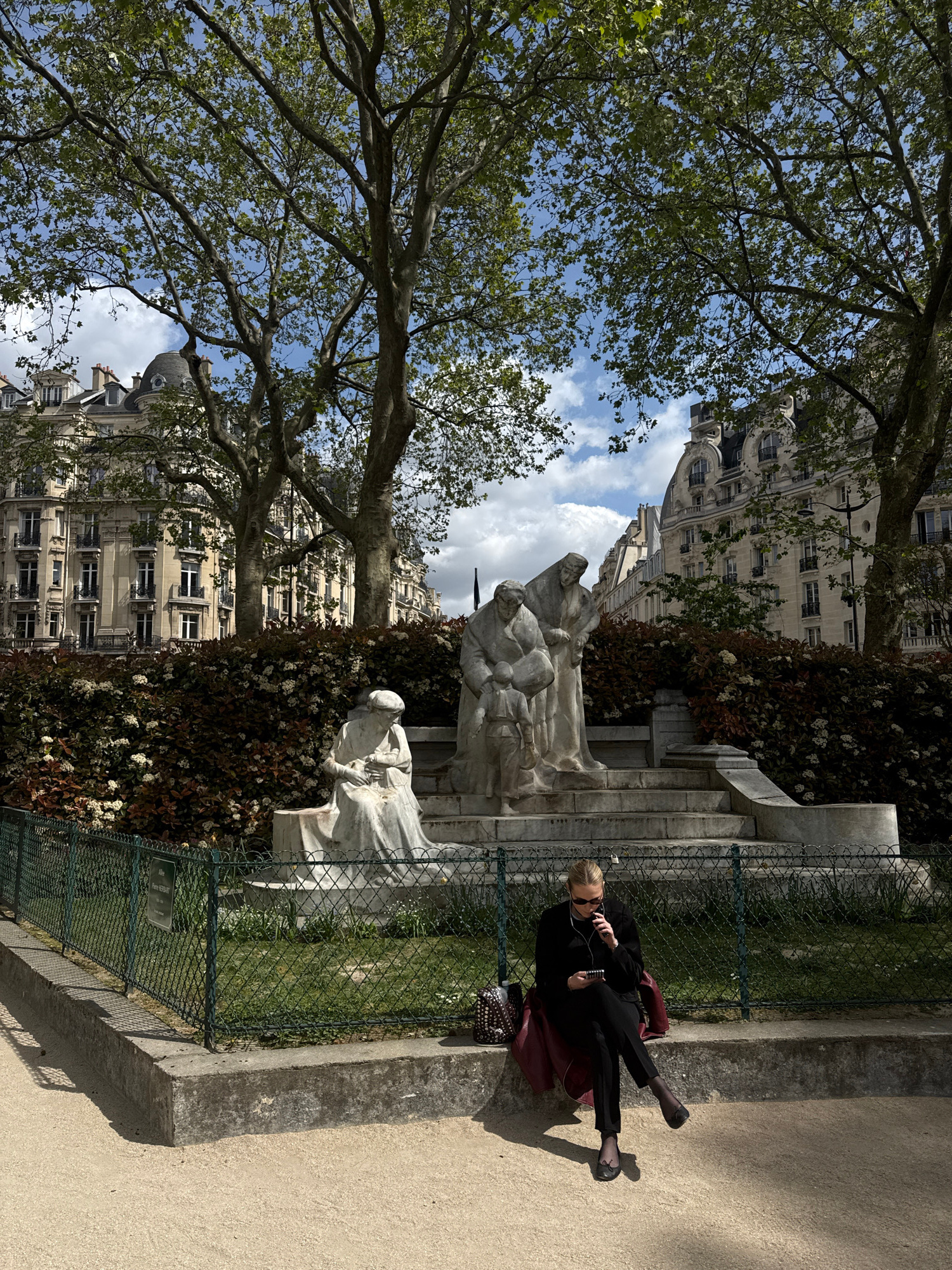 A daytime scene in a park in Paris, France, shows a woman resting on a concrete ledge next to a series of white stone statues. The image is oriented vertically but depicts a horizontal landscape. In…read more