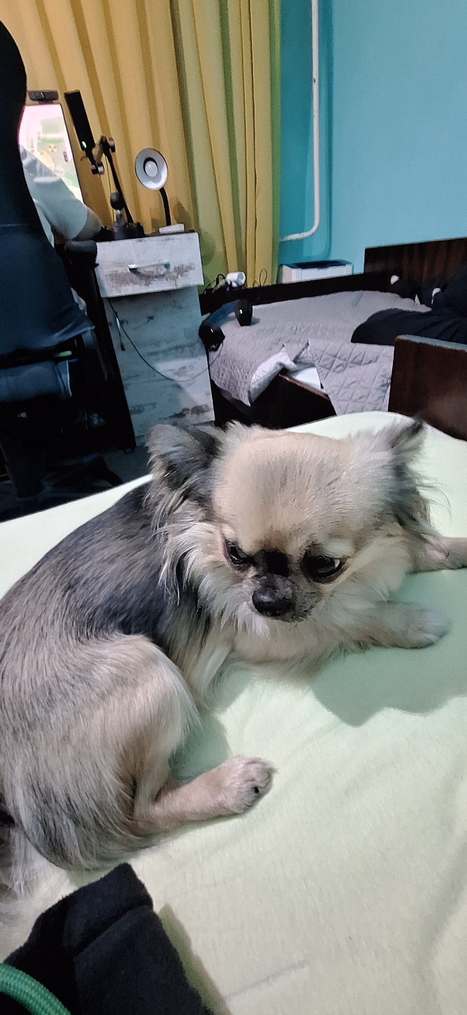 A gray and tan long-haired Chihuahua is lying on its back on a light green surface. The dog's head is oriented towards the upper center of the frame. Its paws are extended upwards and towards the righ…read more