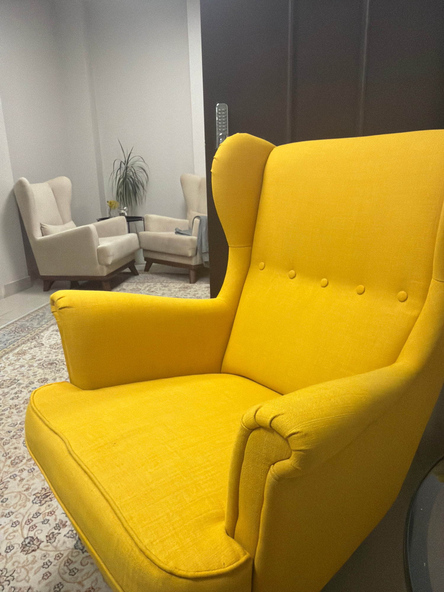 The image shows the corner of a room with a yellow armchair in the foreground. The armchair has buttons on the upper back and a rounded seat. The floor is covered with a patterned rug. In the backgrou…read more