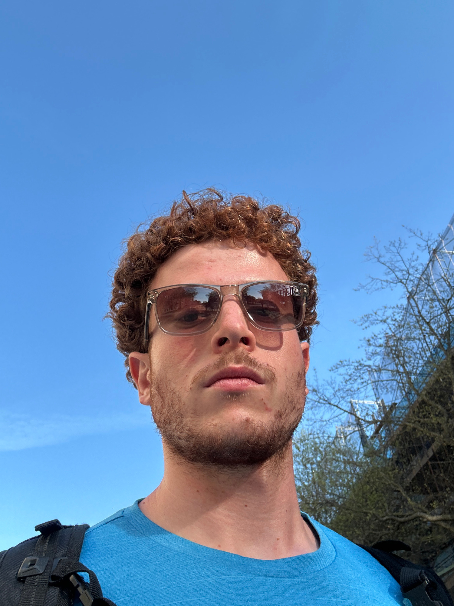 A selfie-style photo, taken from a low angle, shows a person wearing sunglasses, with a blue sky and bare tree branches in the background. The person has light skin, curly brown hair, and a short bear…read more