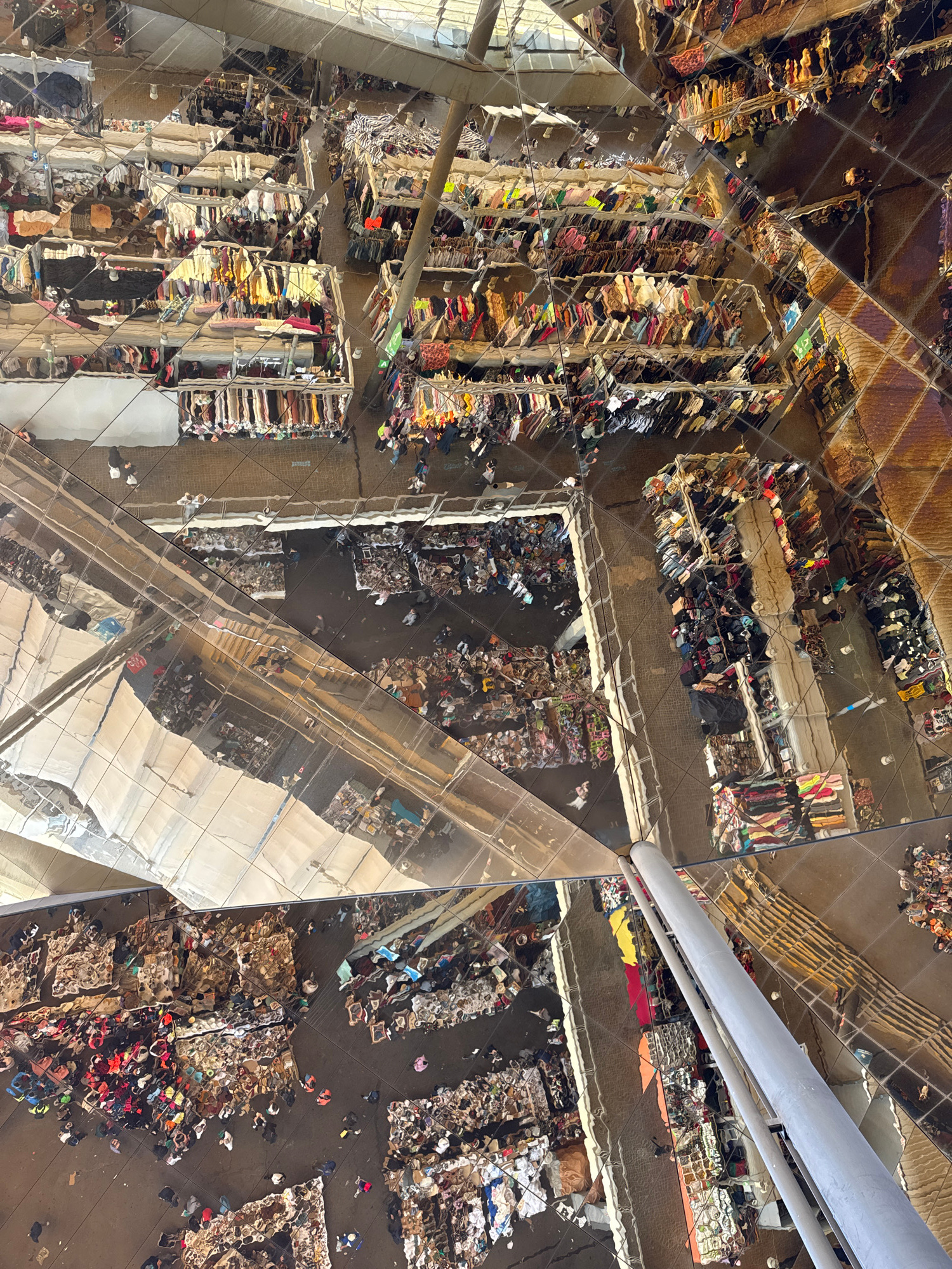 This image captures a high-angle view of a bustling indoor marketplace, viewed through a complex, multi-faceted mirrored ceiling. The scene below is filled with numerous people, appearing as small fig…read more