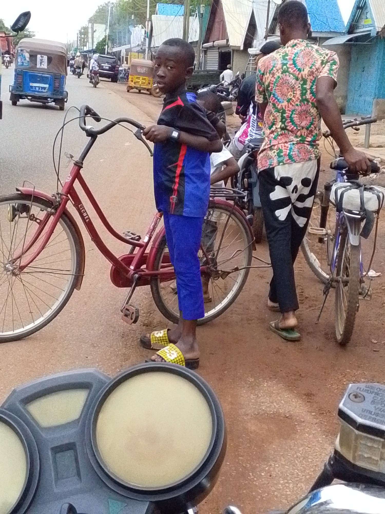 The image depicts a street scene in Tamale, Ghana. A young boy stands holding a red bicycle, facing the camera. He is wearing a blue and black shirt, blue pants, and yellow sandals. Behind him, anothe…read more