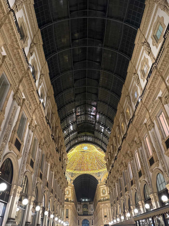 An upward-angle photograph captures the interior of the Galleria Vittorio Emanuele II in Milan, Italy, at night. The scene depicts a grand, covered public passageway flanked by two multi-story, ornate…read more