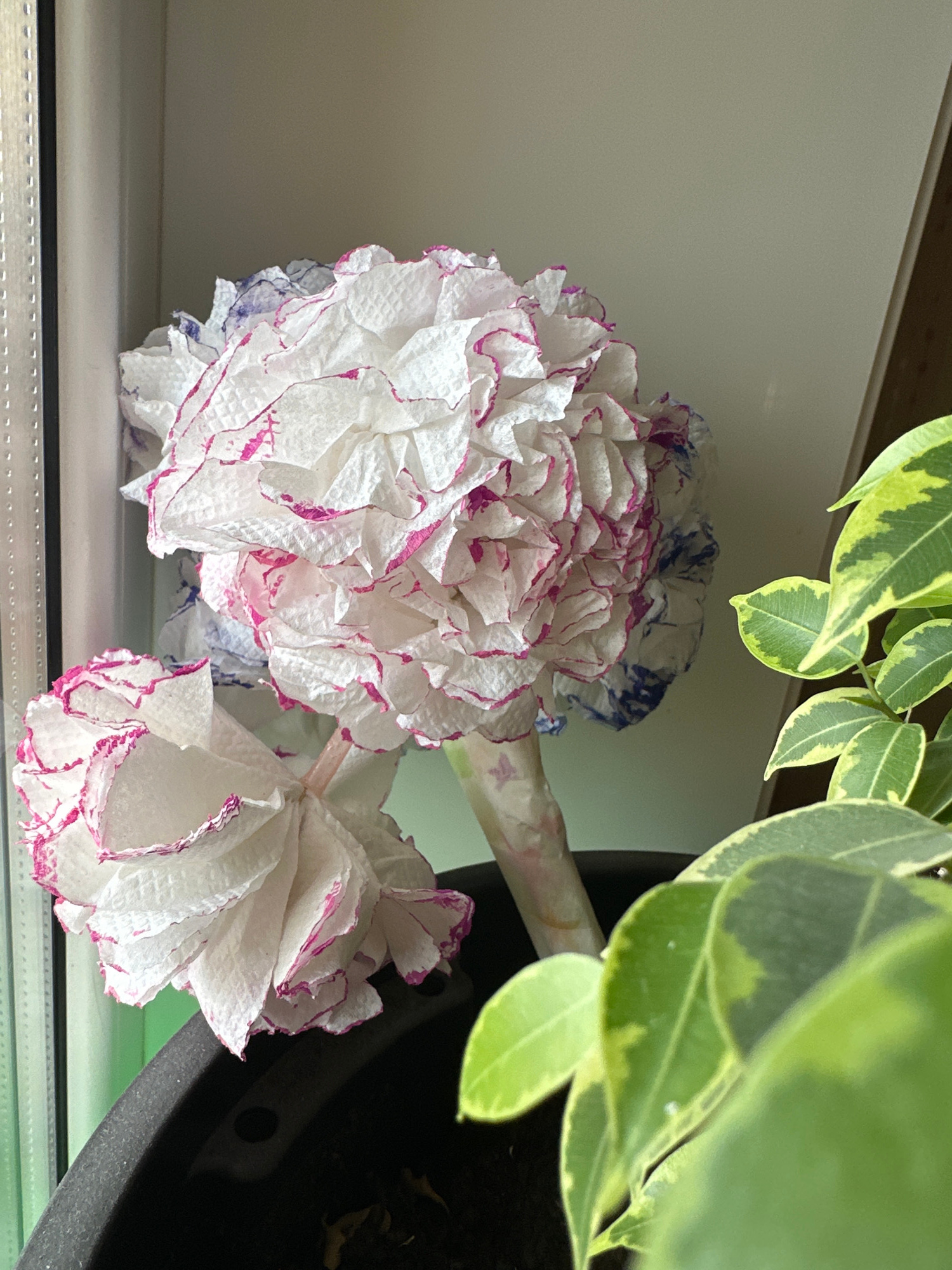 The image shows two handmade paper flowers with white petals edged in pink and blue, resting on a light-colored shelf next to a black flower pot. The leaves of a plant with variegated green and yellow…read more