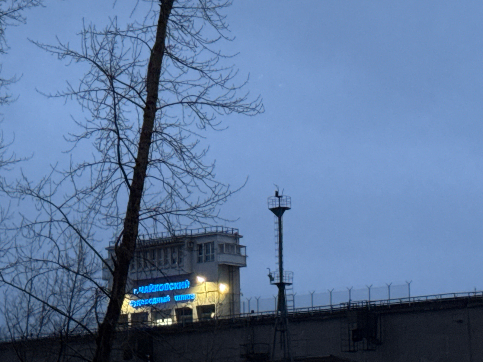 The image shows the Chaikovsky lock system on the Kama River in the city of Chaikovsky, Russia, at dusk. A bare tree stands in the foreground on the left. Behind the tree is a tall structure, with a c…read more