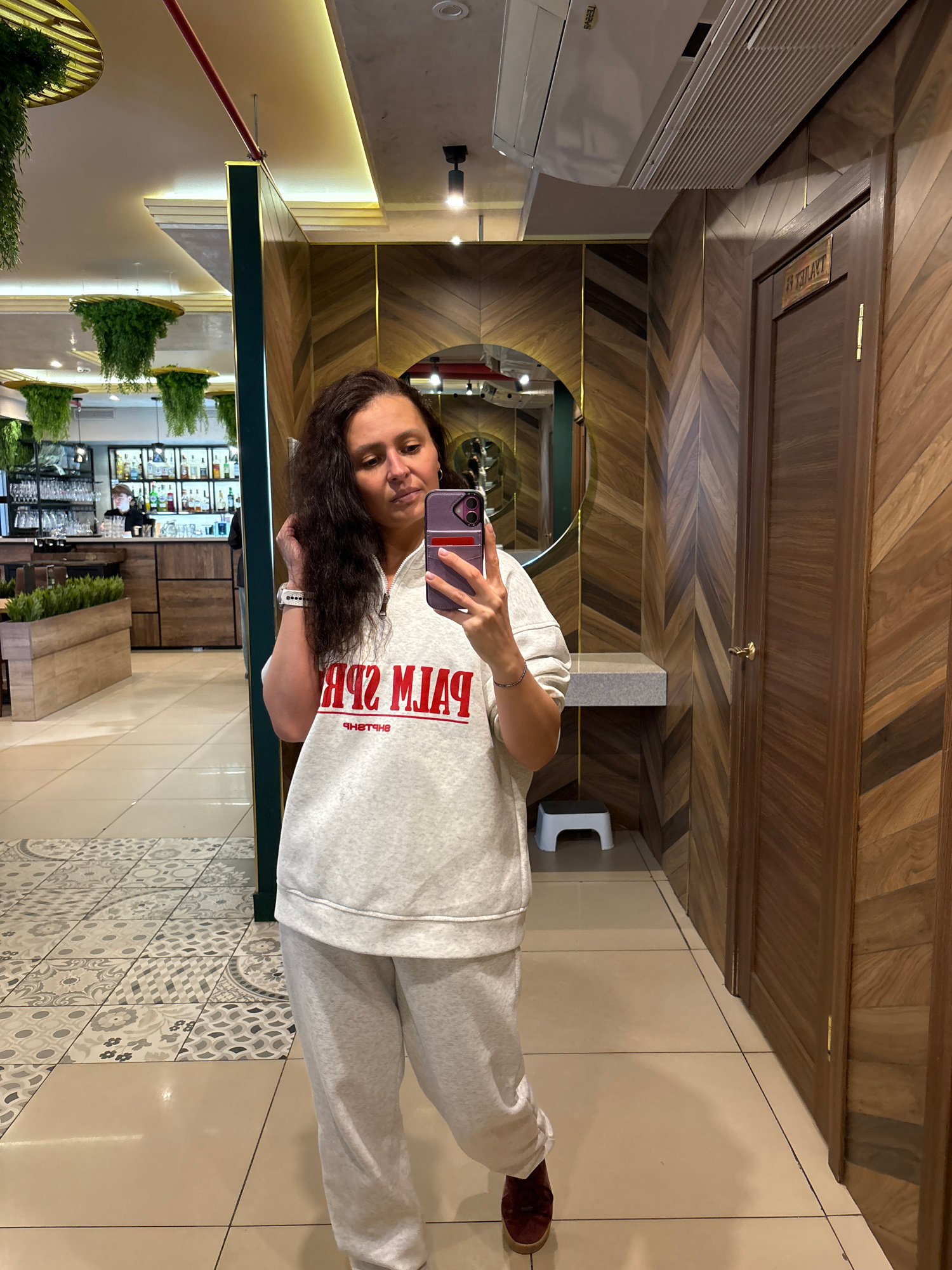 A woman is taking a mirror selfie in what appears to be a restaurant or bar setting. She is holding a smartphone and posing, showing off her hair. She is wearing a light gray sweatshirt and matching s…read more