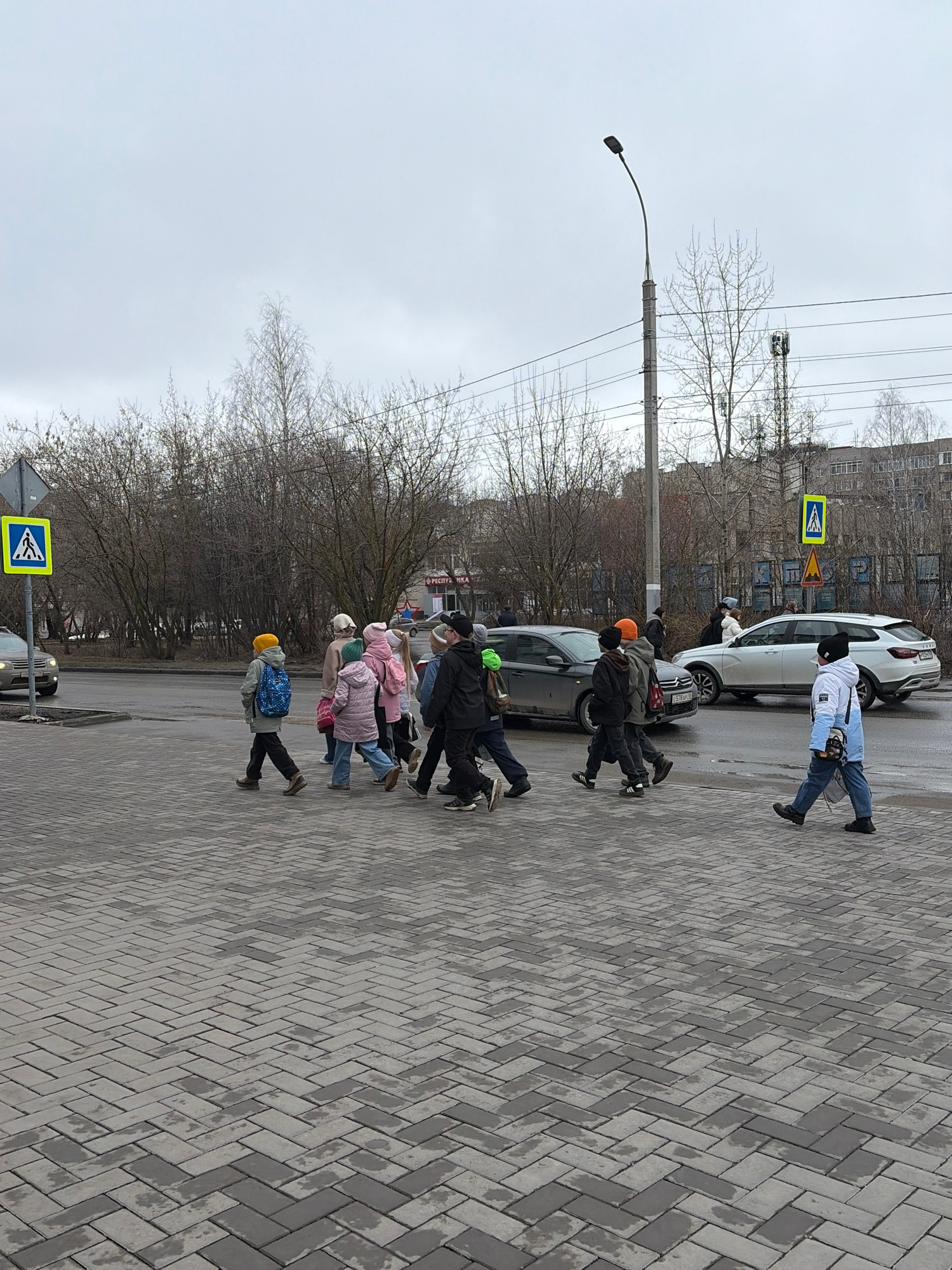 A group of people are crossing a pedestrian crosswalk on a paved road in what appears to be an urban environment. The location is Izhevsk, Russia. There are several pedestrians, including children we…read more