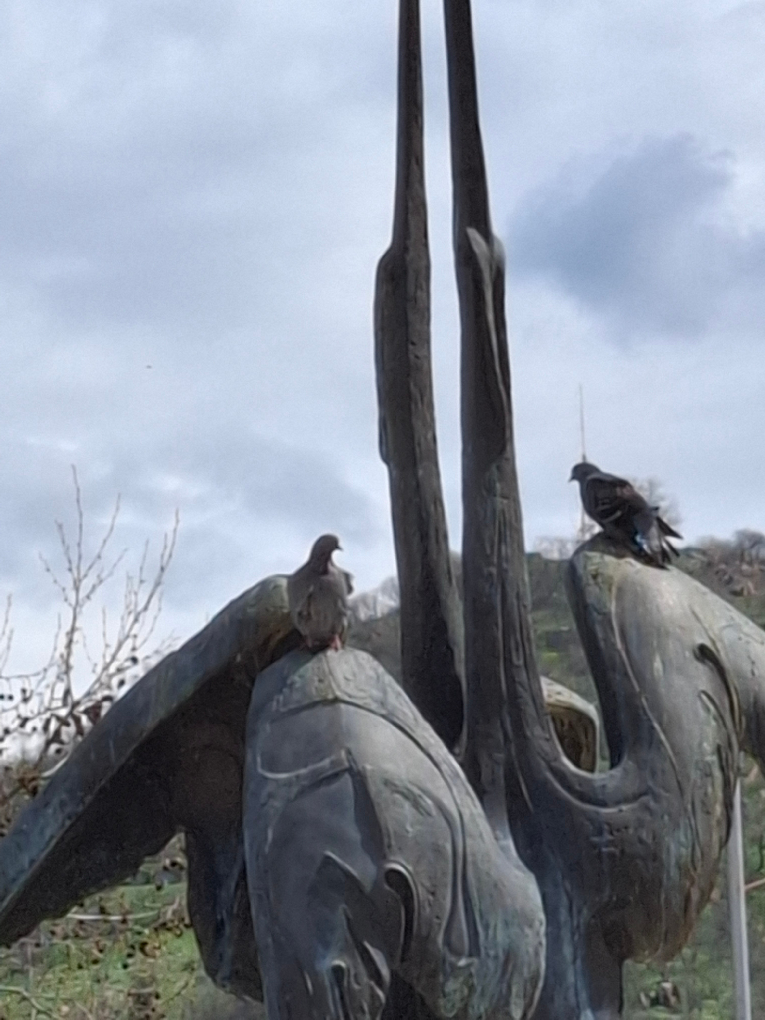 A low-angle, close-up shot shows a bronze statue in Plovdiv, Bulgaria, likely outdoors due to visible vegetation and a cloudy sky. The statue depicts a figure or figures rendered in an abstract, metal…read more