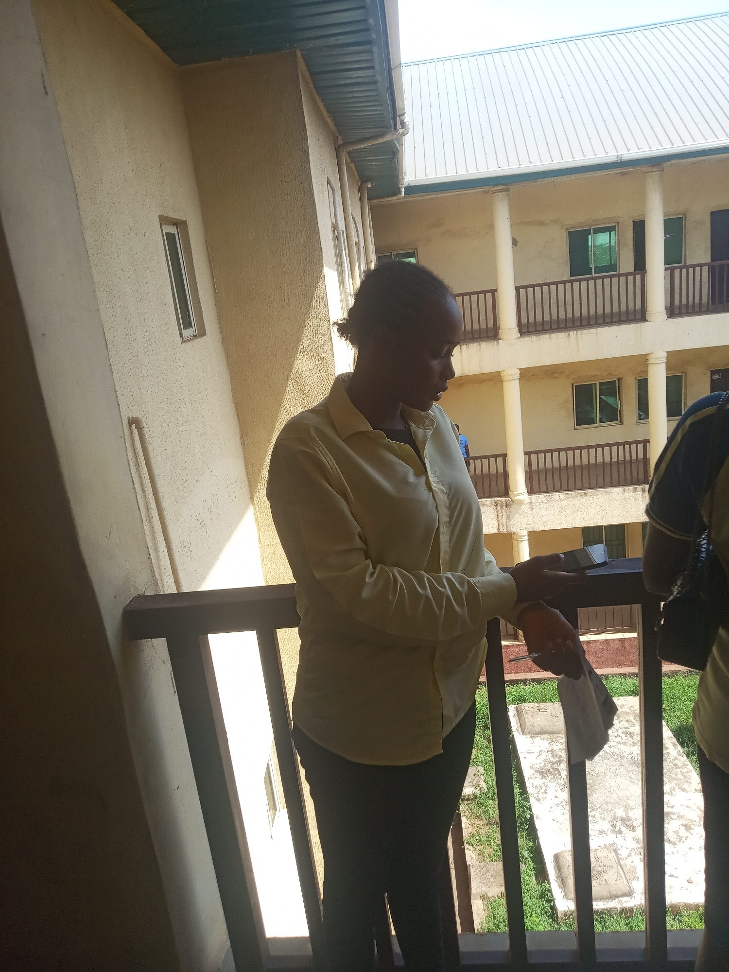 The image depicts a daytime scene on a balcony of a multi-story building, likely in Onitsha, Nigeria. In the foreground, a woman stands facing slightly right, looking down at her hands. She wears a li…read more