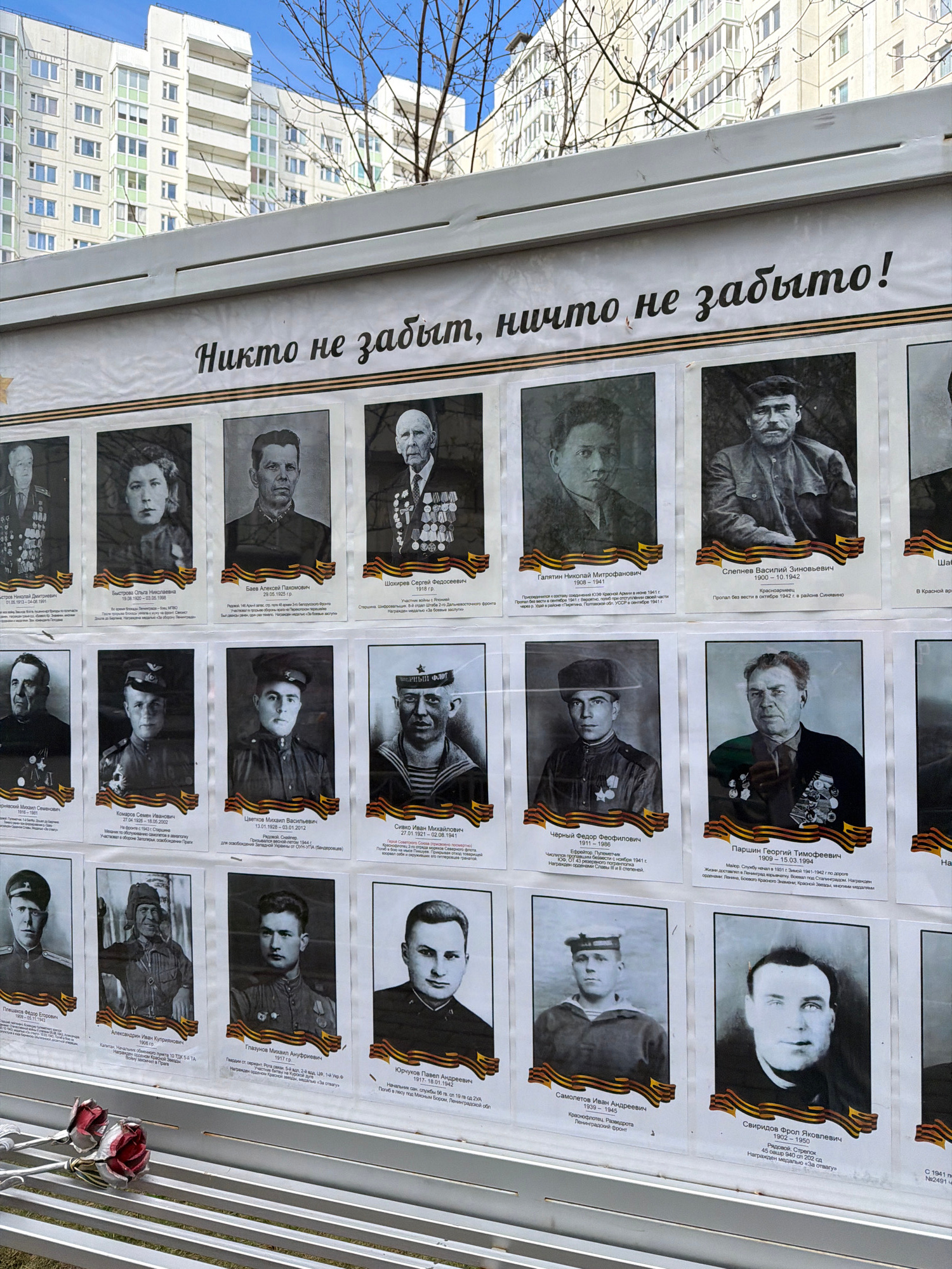 The image displays a large outdoor memorial board, likely a "Wall of Remembrance" or "Immortal Regiment" exhibit, featuring numerous black-and-white portraits of individuals. These are predominantly m…read more