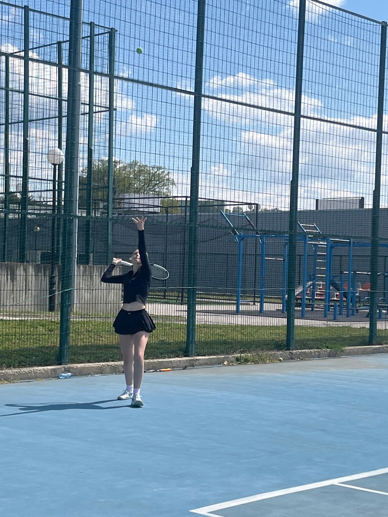 A woman is playing tennis outdoors on a blue tennis court. She is serving the ball, wearing a black long-sleeved shirt and black skirt, and white shoes with light-colored socks. She holds a tennis rac…read more