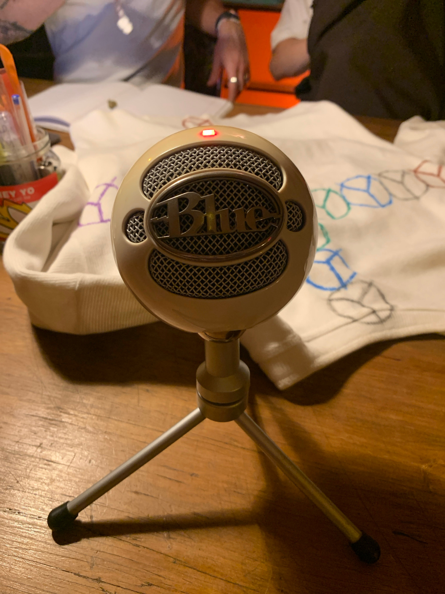 A gold-toned Blue Yeti microphone, with its red indicator light illuminated indicating it is active, stands prominently on its matching tripod. The microphone is positioned on a warm-toned wooden surf…read more