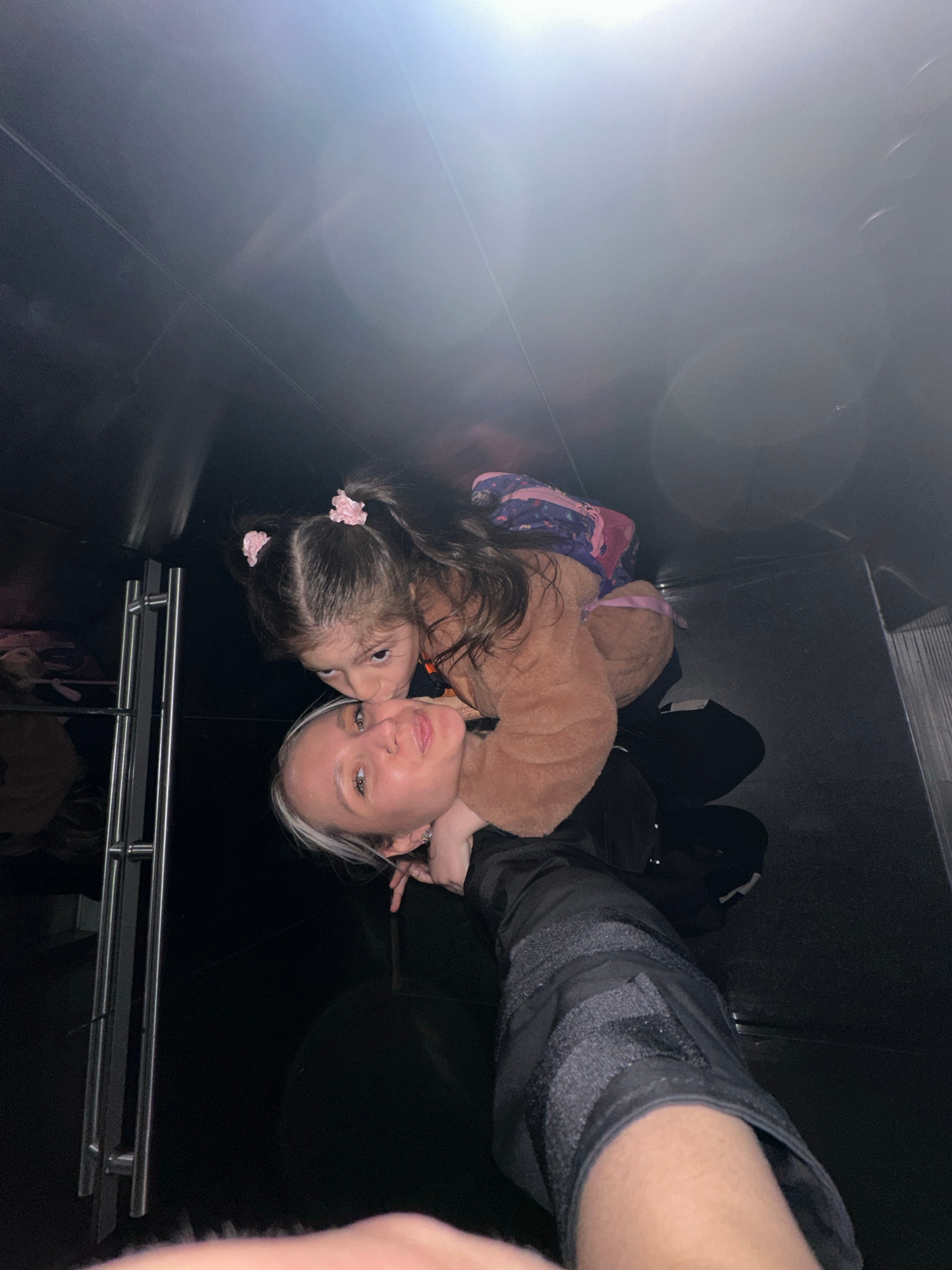 A woman and a young girl are in a dark, enclosed space, possibly an elevator, in Esenyurt, Turkey. The woman has short white hair with dark roots and is wearing a dark top. The young girl has long dar…read more