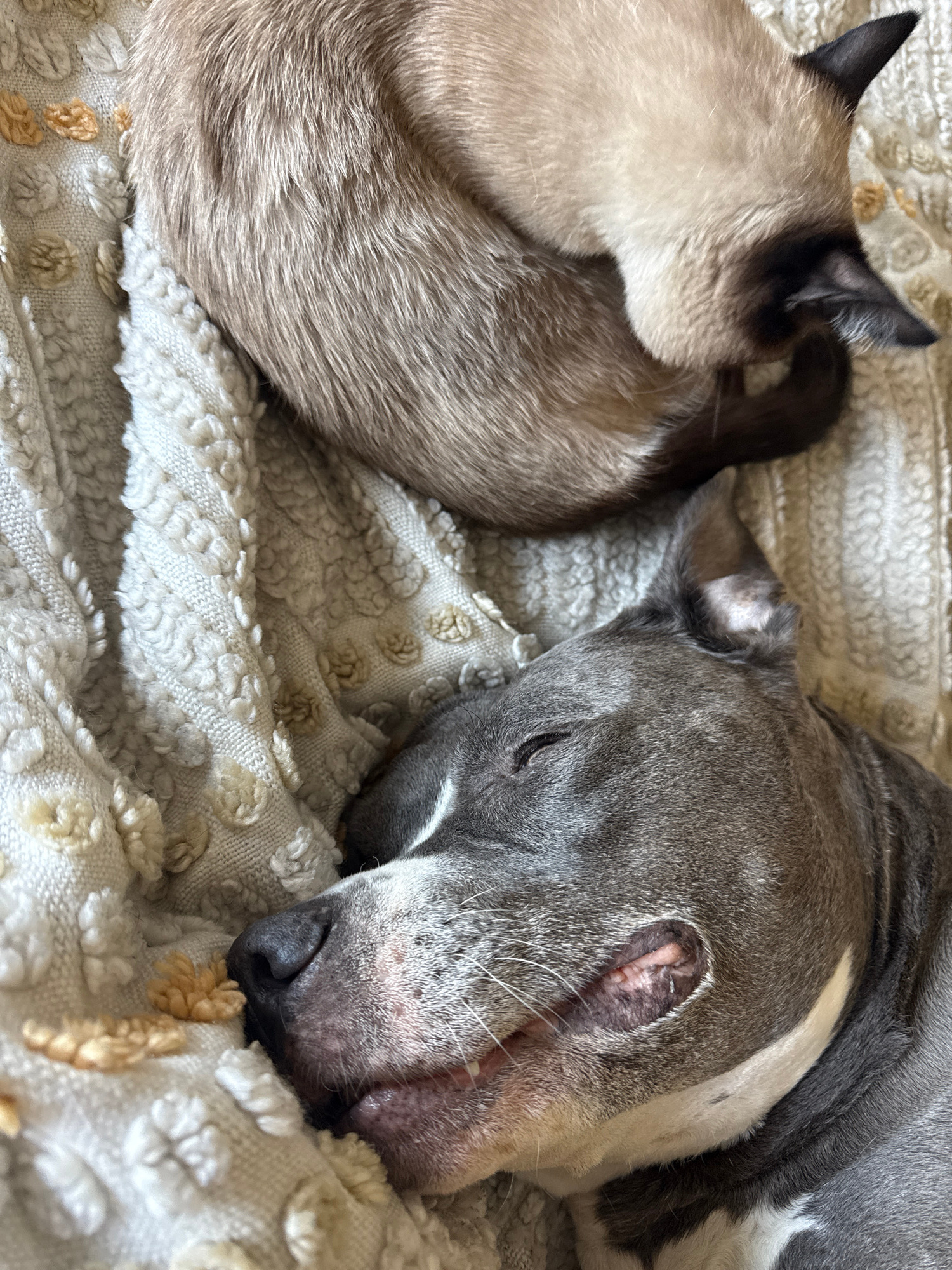 A close-up shot depicts a gray and white pit bull dog and a Siamese cat sleeping on a textured, light-colored blanket with raised patterns. The dog is positioned to the right, with its head resting on…read more