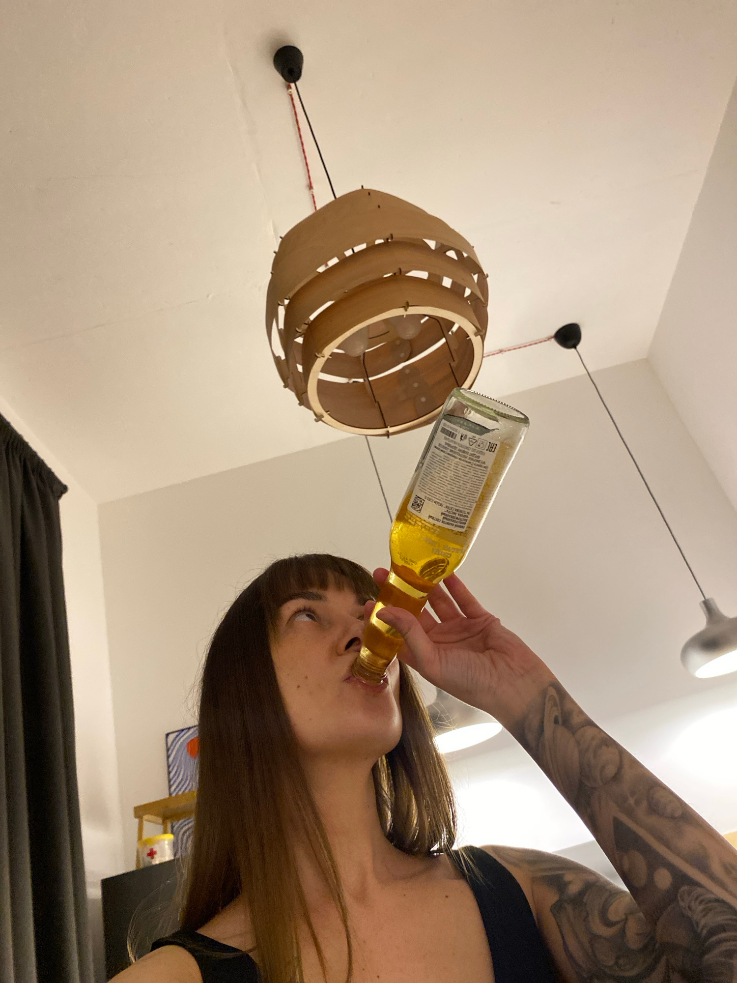 A woman with long brown hair is drinking from a beer bottle. She's wearing a black top. Her arm has a large tattoo. In the background, there's a wooden, circular lamp hanging from the ceiling. There's…read more