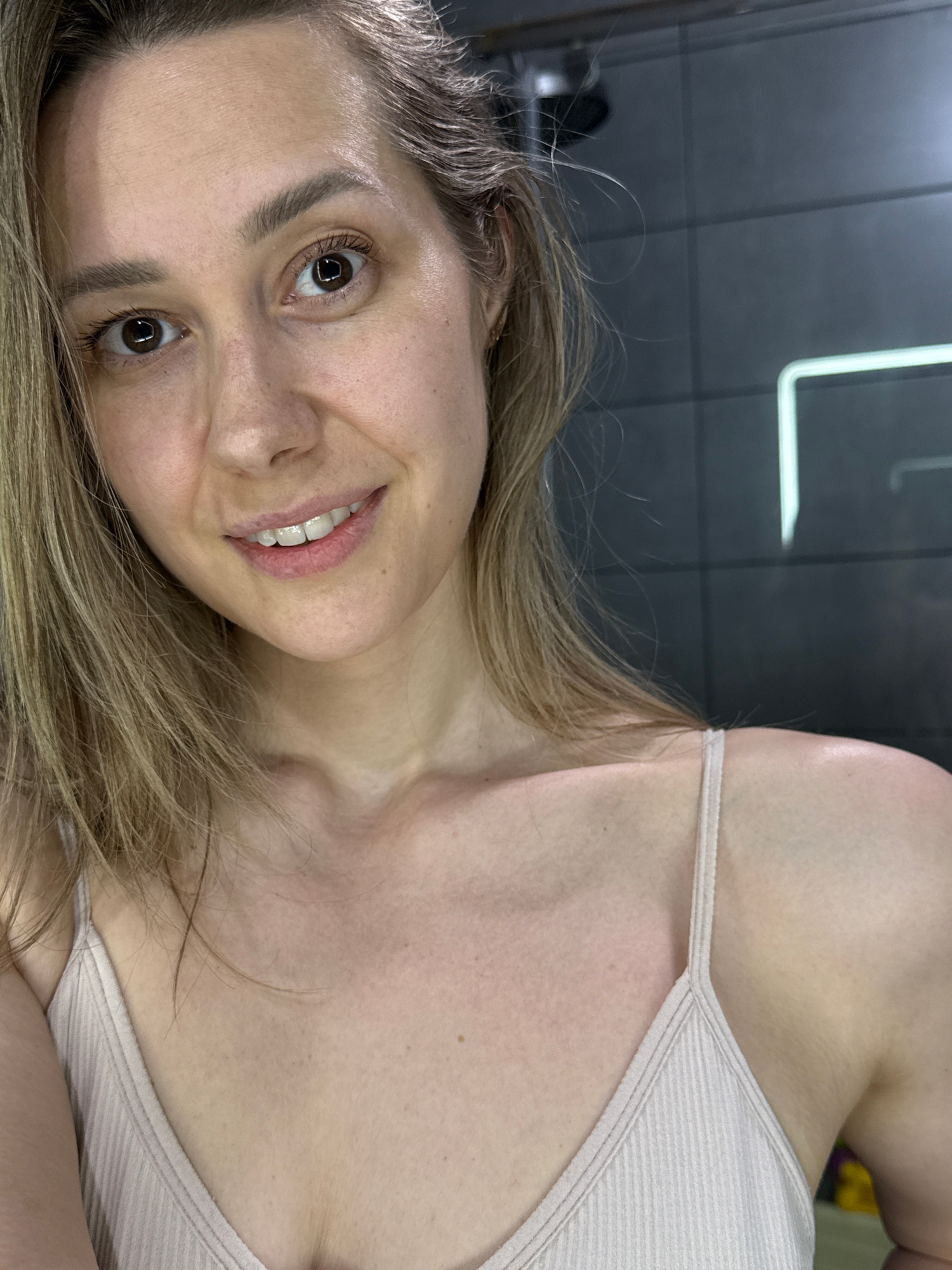A woman is lying on her side, smiling, facing the camera. She has light brown hair, brown eyes, and fair skin. She is wearing a light-colored ribbed tank top. The background is a dark, smooth surface…read more