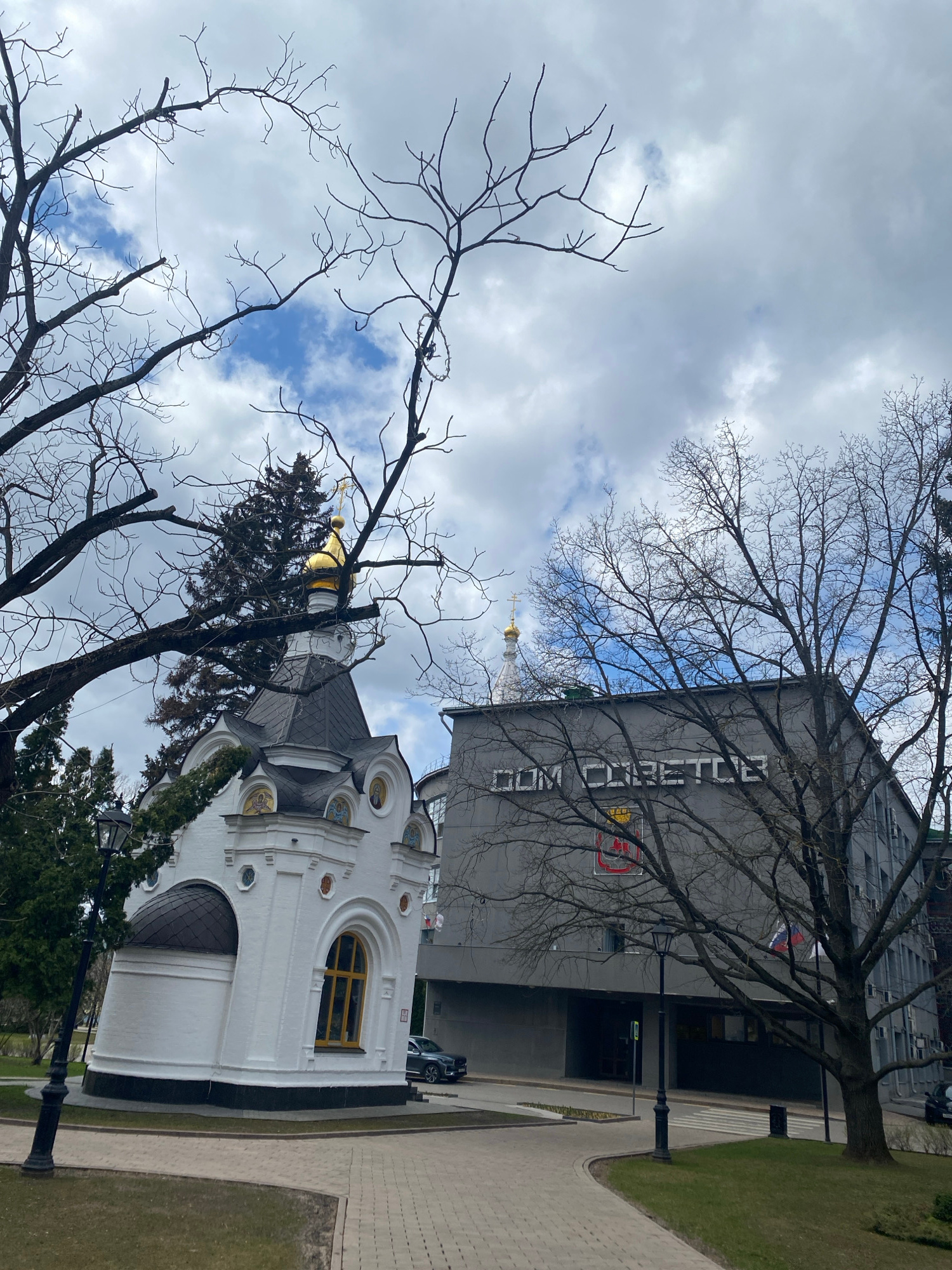This image captures an outdoor urban scene in Nizhny Novgorod, Russia, likely during late winter or early spring due to the bare branches of the deciduous trees. The weather appears overcast with patc…read more