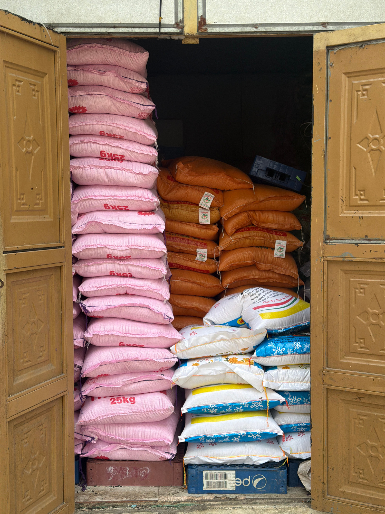 A street-level view in Đà Nẵng, Vietnam, shows a doorway filled with stacks of rice sacks. The door is a two-panel design with decorative carvings and a weathered appearance, suggesting age. The rice…read more
