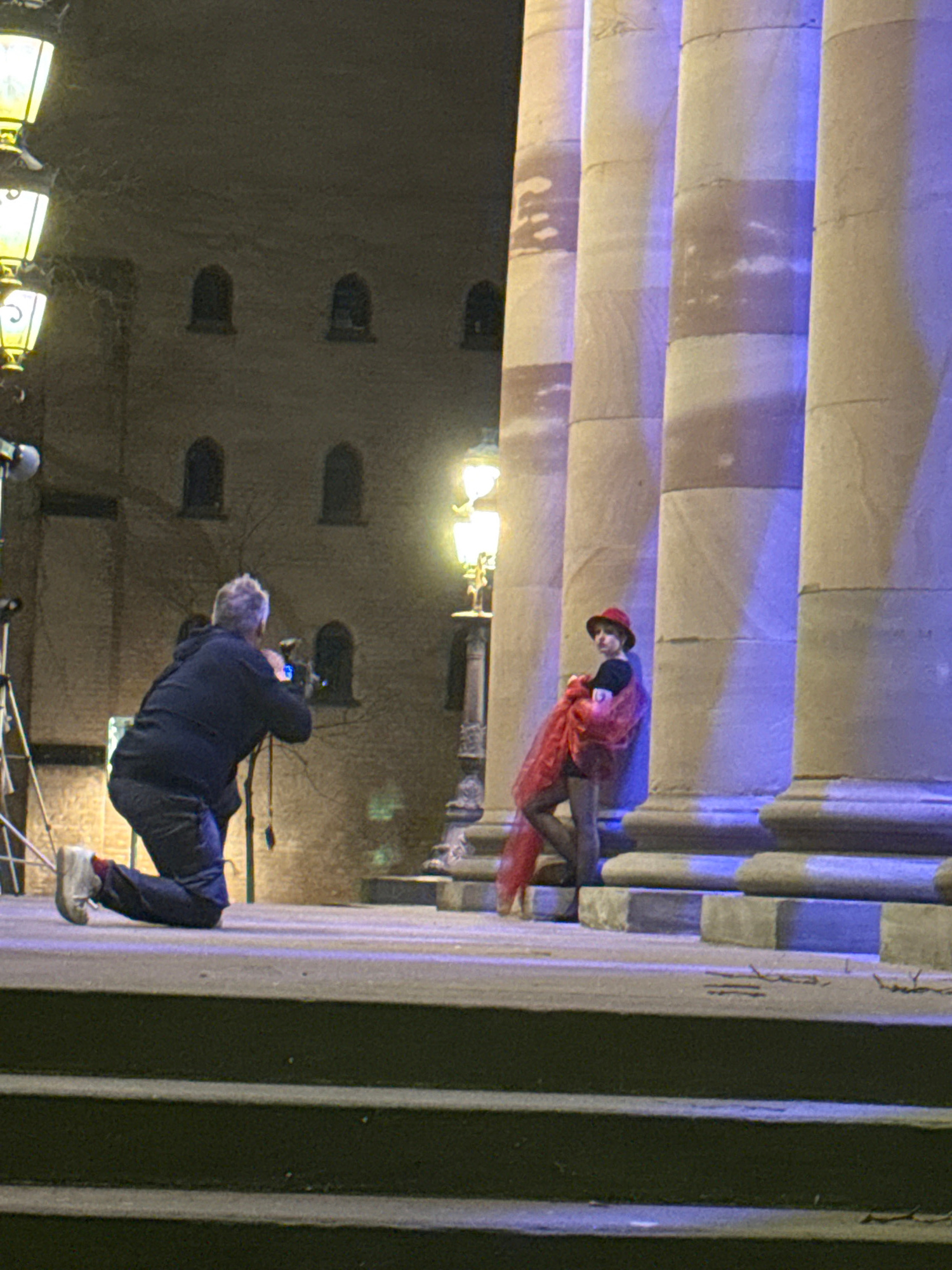 A photographer takes a picture of a person on the steps of the Palais Rohan in Strasbourg, France. The photographer kneels on a platform and points the camera at the subject, who is wearing a red hat…read more