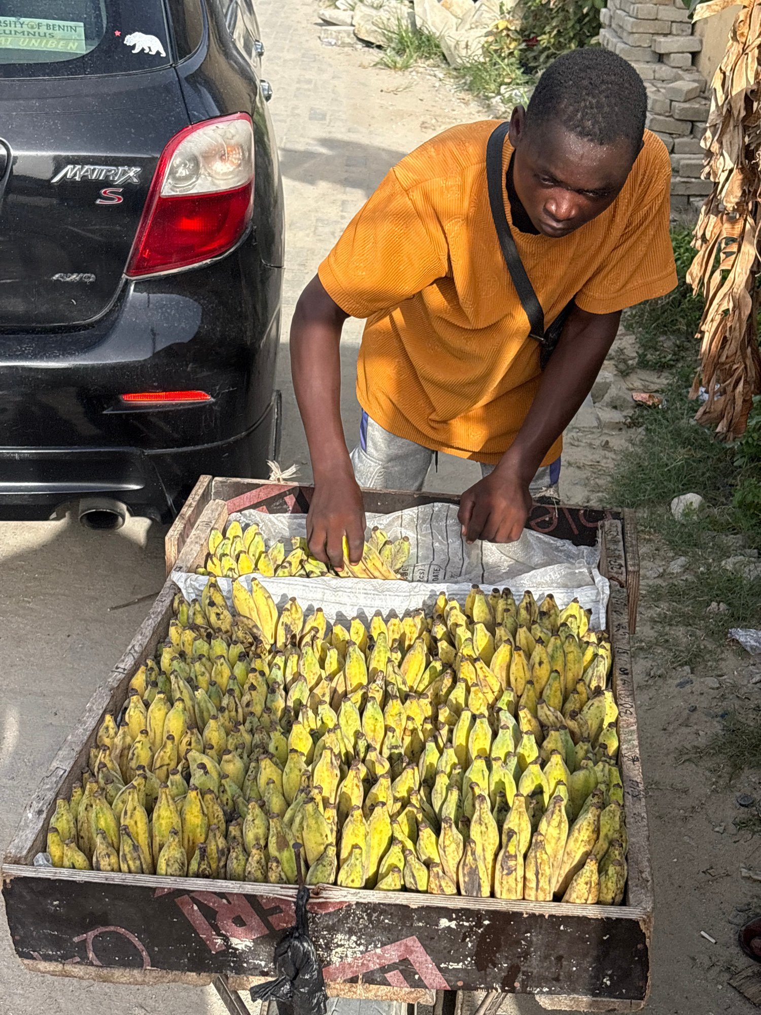 A man in an orange shirt is standing next to a black car with a license plate that says "UNIVERSITY OF BENIN UNIBEN." The car is a Matrix S. The man is reaching into a cart filled with plantains. The…read more