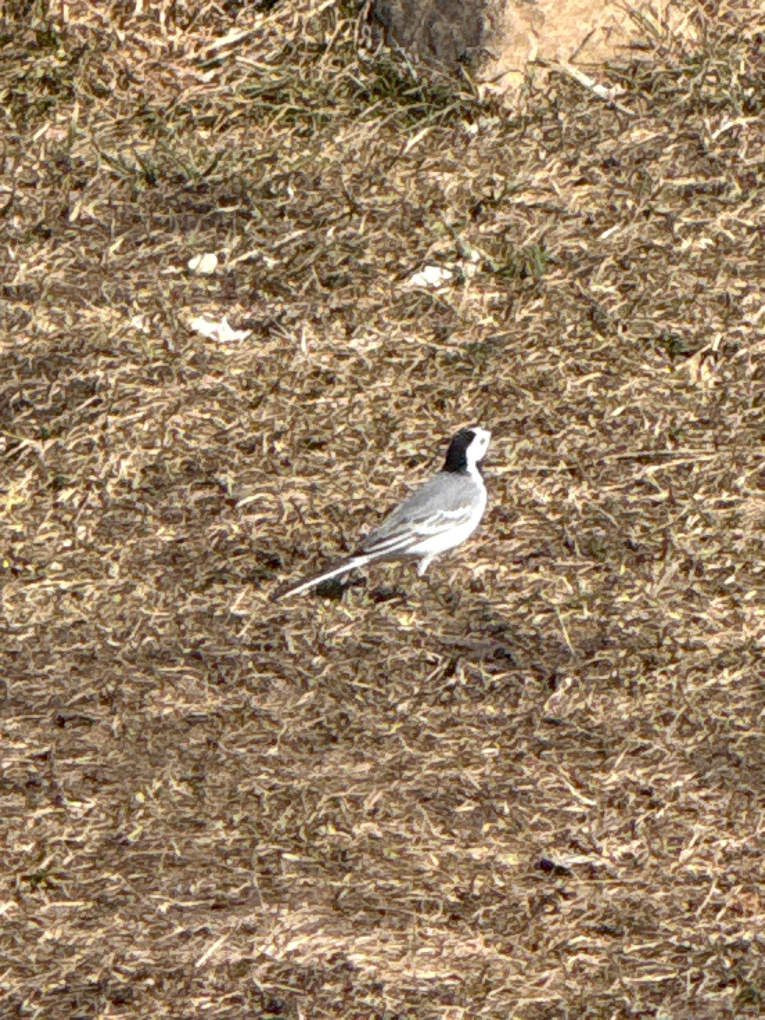 A white wagtail (Motacilla alba) bird is seen on the ground covered with dry grass and vegetation. The photograph was taken in Tyulyuk, Russia.