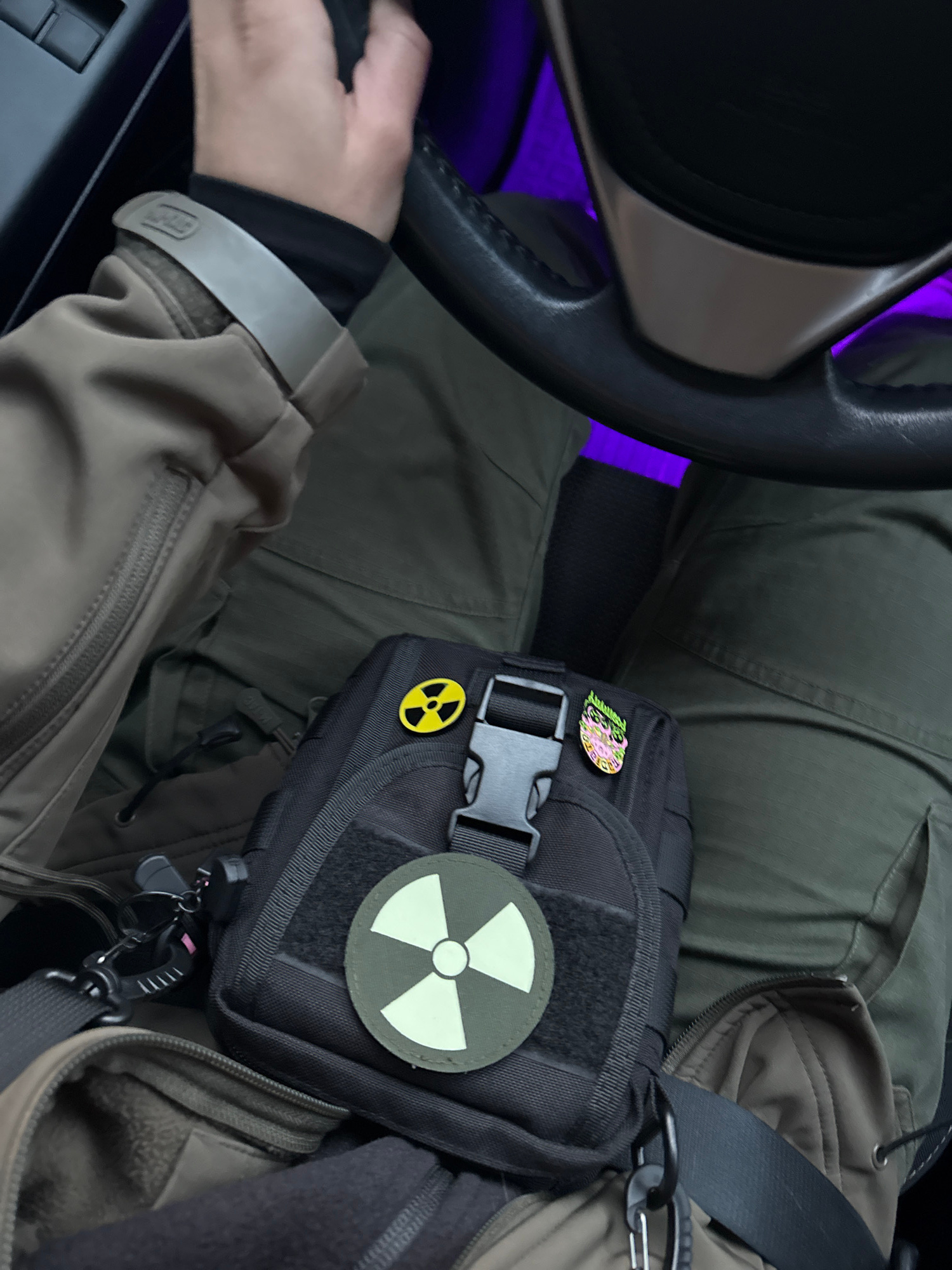 A person sits in the driver's seat of a vehicle, possibly a car, with a black tactical bag resting on their lap. The bag is adorned with a radiation symbol patch and a yellow radiation hazard pin. The…read more