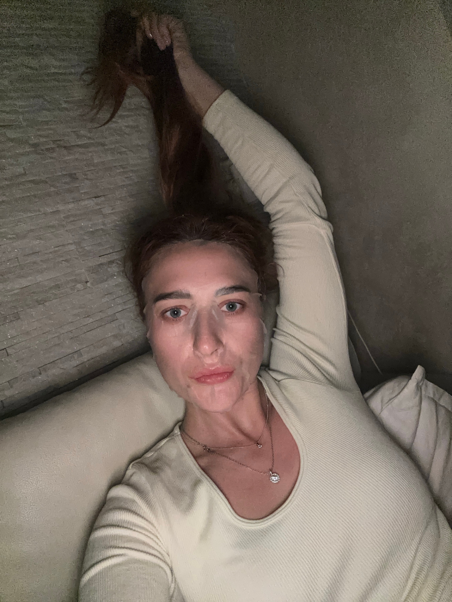A woman lies on a light-colored upholstered surface, possibly a couch or daybed, her head tilted to the right. She wears a light beige, long-sleeved ribbed shirt, a necklace with a pendant, and what a…read more