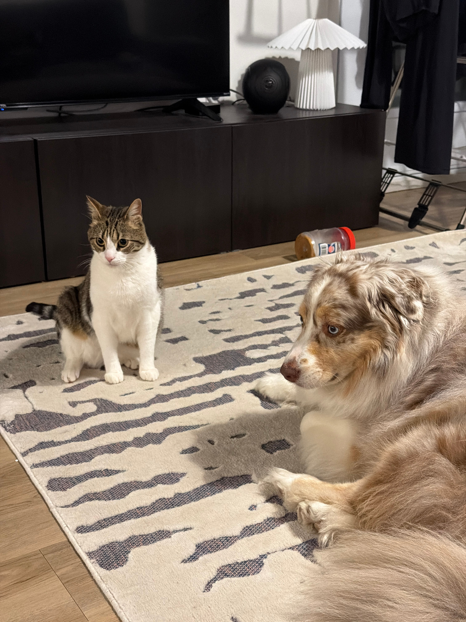 The scene depicts a cat and a dog on a rug indoors. The cat is white and grey tabby, sitting and looking towards the camera. The dog is lying on the rug to the right of the cat, primarily brown and wh…read more
