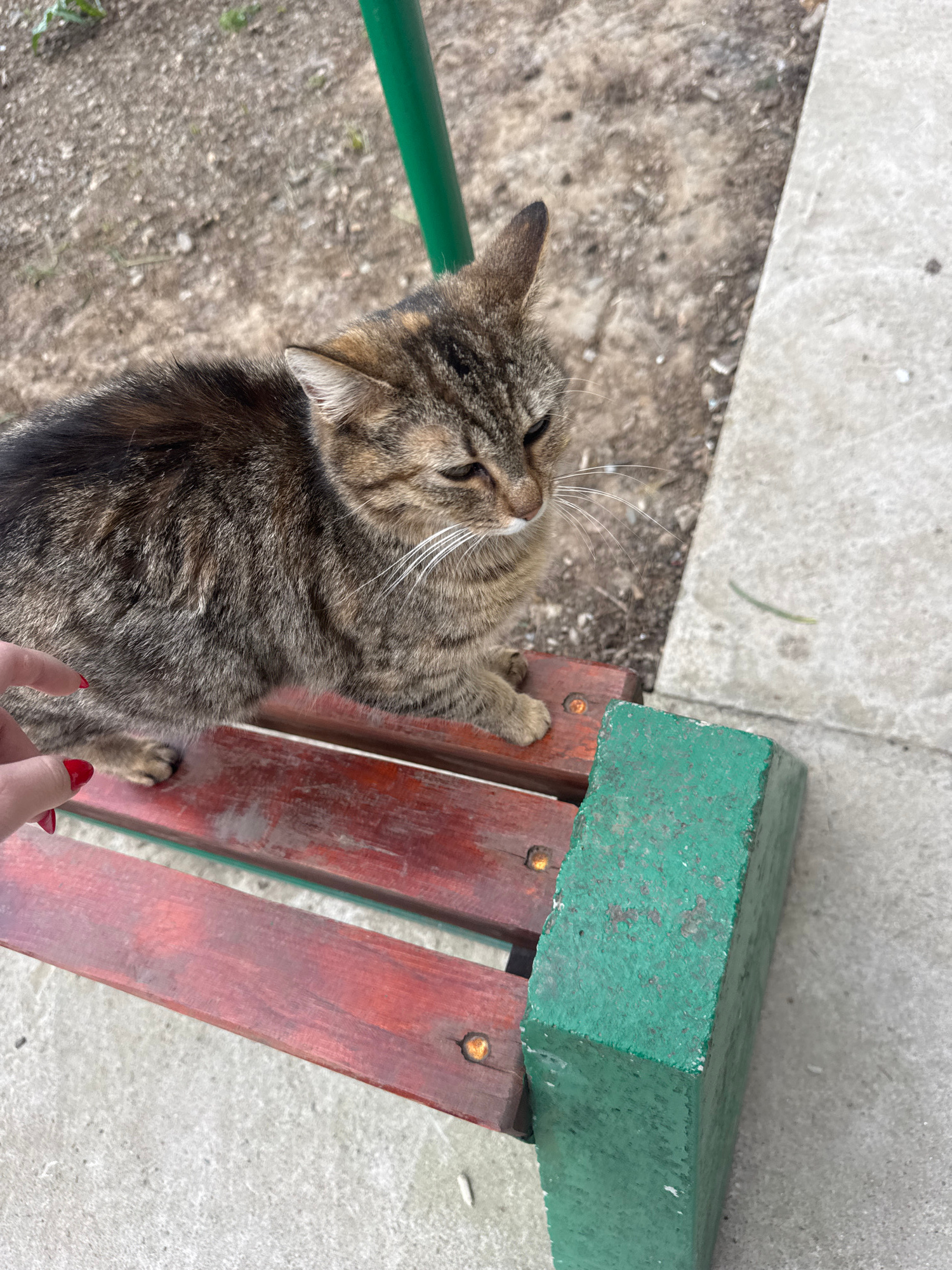 A high-angle shot depicts a tabby cat resting on a wooden bench with a green painted concrete support. The cat lies on its side with its head tilted back, appearing to look upwards. A portion of a han…read more
