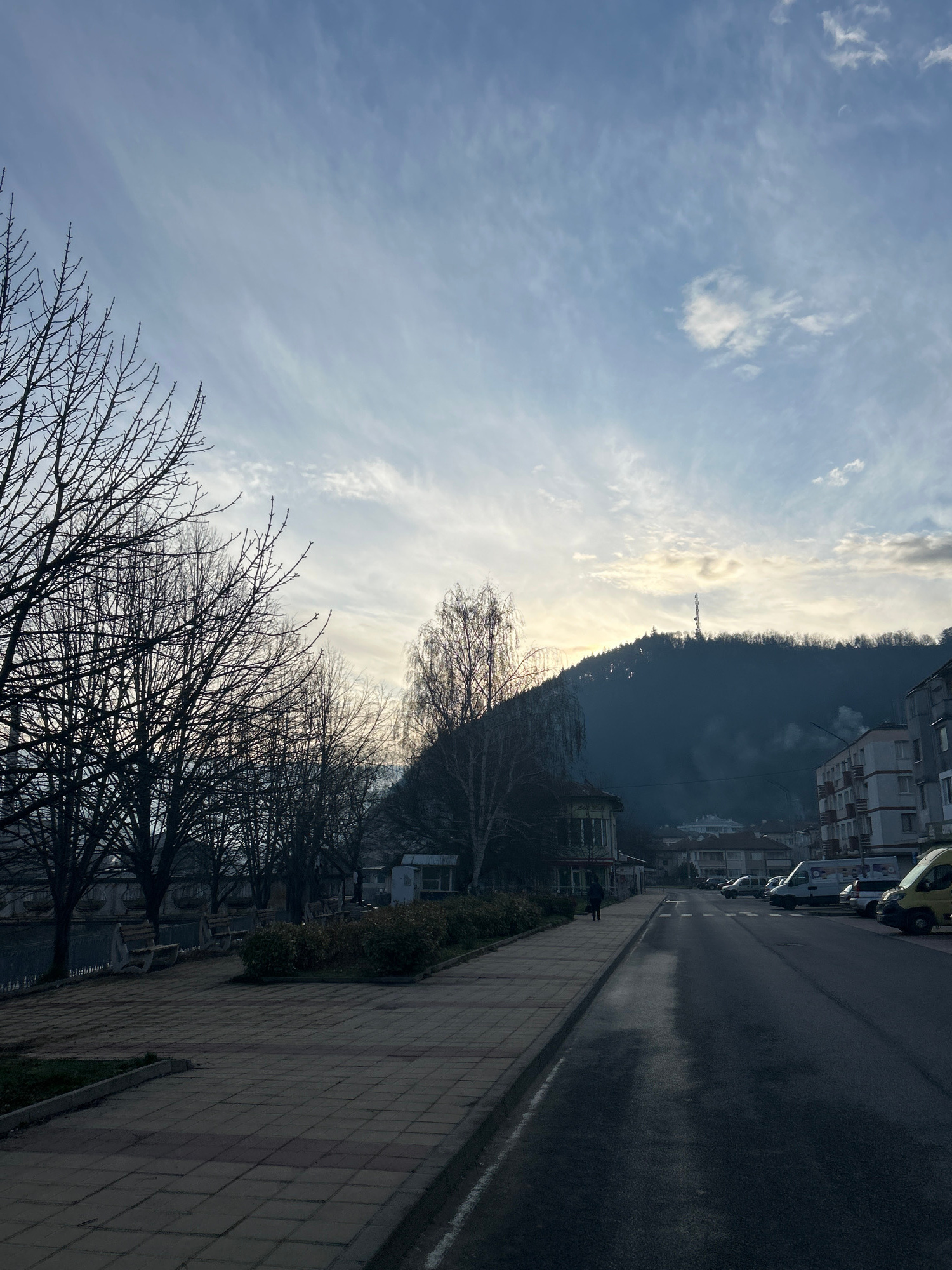 The image depicts a street scene in Zlatograd, Bulgaria. The view is from the sidewalk, looking towards a wet, dark asphalt road lined with parked vehicles. The sidewalk is paved with grey and pink br…read more